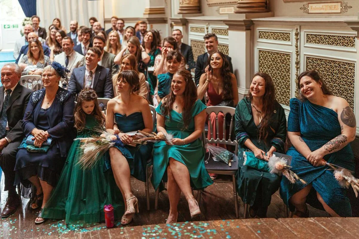 With Mel originally from the U.S., many of her family members traveled internationally to witness this destination wedding in Wales. Their peacock-themed color scheme perfectly complemented Mel’s boho bouquet of bunny tails, pampas grasses, and peacock feathers—a stunning contrast against the castle’s historic stone walls.