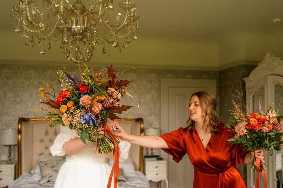 We loved the colour scheme of Charlotte and Alex’s wedding. They fully embraced autumn colours with beautiful bouquets of wildflowers, created by Sharon at Floral Innovations that complemented the bridesmaids rust satin dresses bought from Rewritten Bridesmaids perfectly.