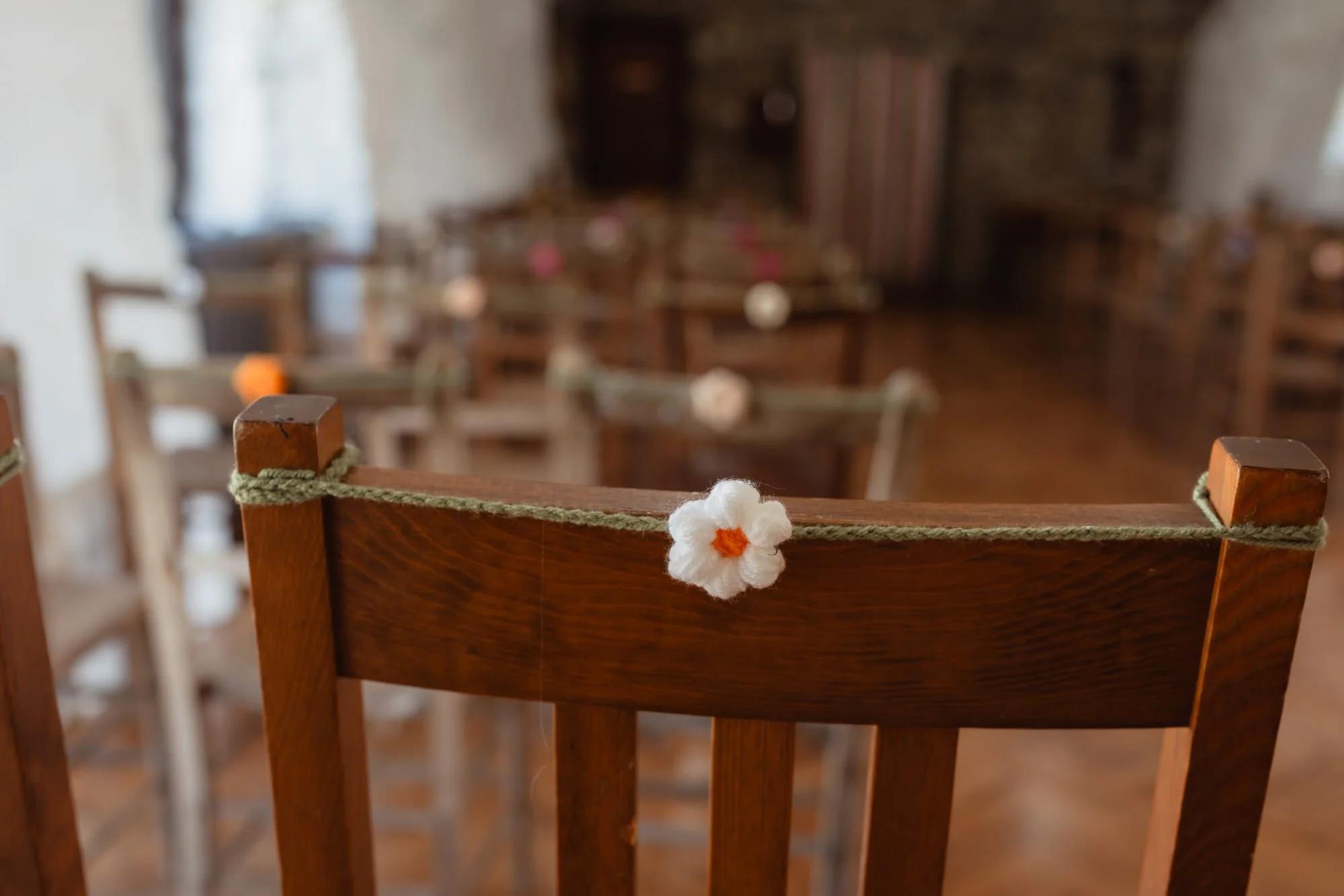 The ceremony space was simply decorated with crochet flowers on the back of each chair and a backdrop of streamers moving gently in the breeze. Wildflowers and handmade details ran through everything.
