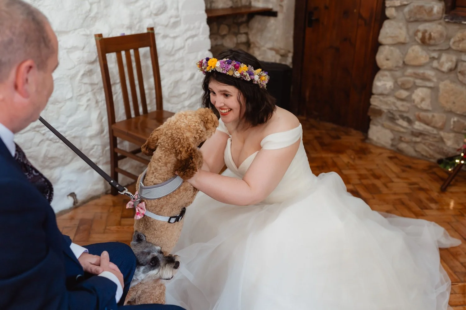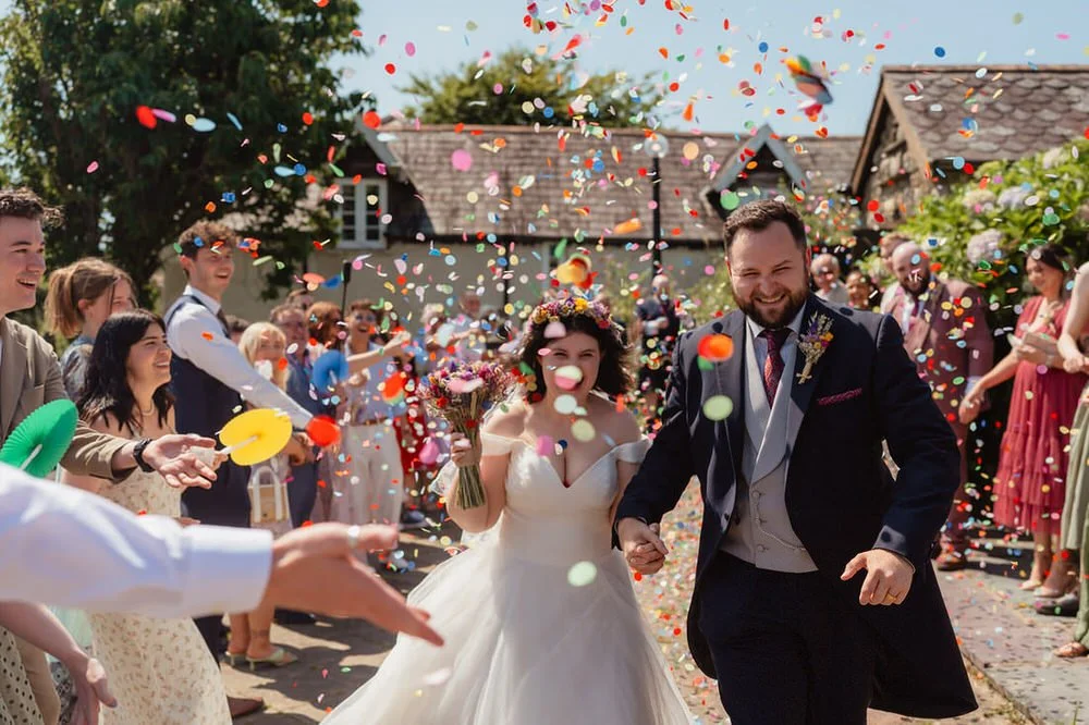 Percy and Mash, the couple’s two very sweet dogs, were given extremely important roles walking down the aisle. They were keen to congratulate their humans immediately after the vows, and the bride happily let them climb onto the dress for a cuddle. It was joyful, slightly chaotic and completely perfect. When it came to confetti outside the Clyne Farm stone building, colourful paper filled the air and the couple were so excited they ran straight through it laughing. They moved so quickly the first time that we had to do it again.