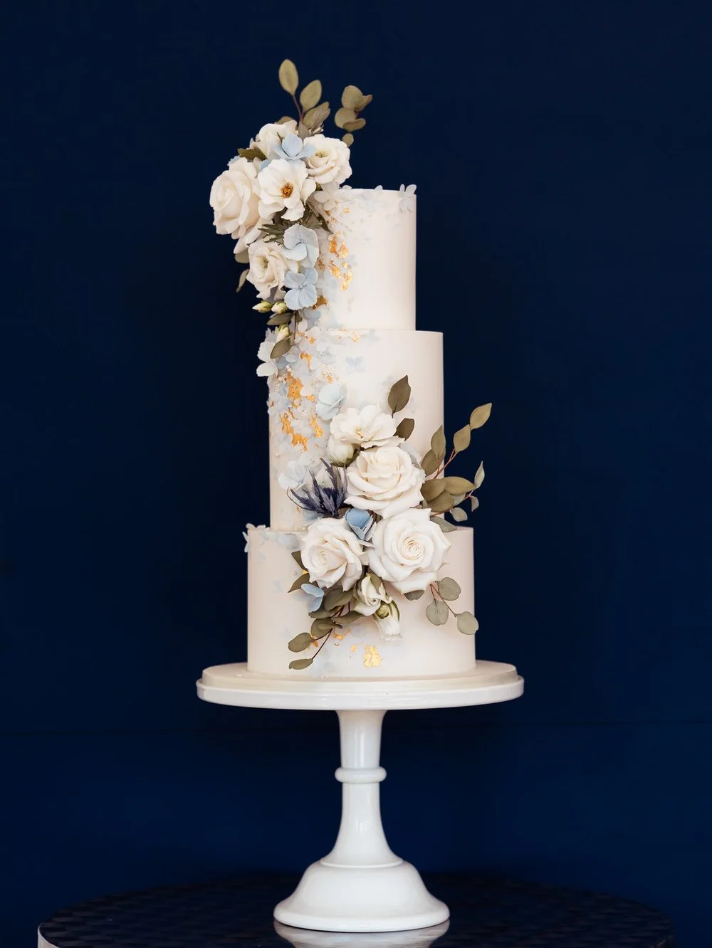 Joyful and unexpected! A clean white cake surrounded by oversized felt flowers in yellow, orange and soft blue. Graphic, fun, and full of personality. It felt like a wedding cake wandered into a colourful children’s book and said, “yes, this is my life now.”