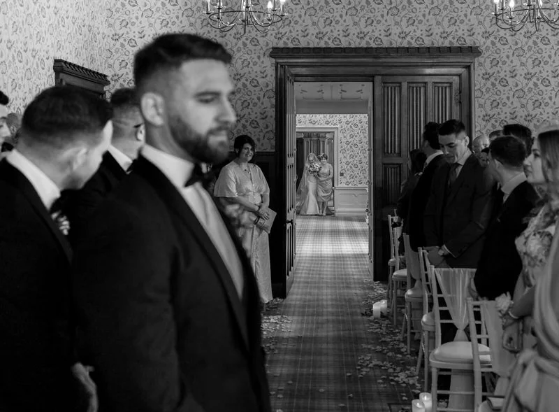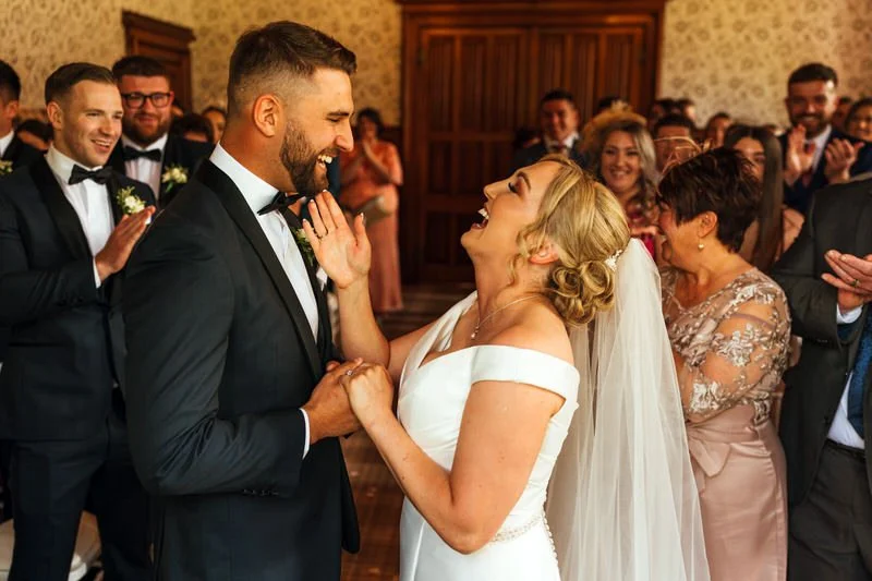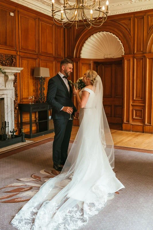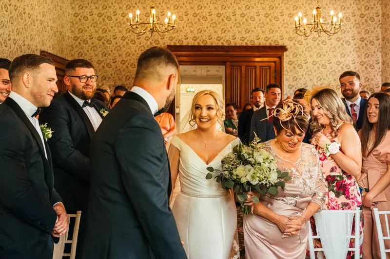 The ceremony took place in Hensol’s opulent Oak Room—a wood-panelled showstopper with arched windows, period features, and tons of natural light. Lucy walked down the aisle with her mum, and the whole ceremony had such a warm, personal feel. We especially loved capturing all the laughter between Lucy and Sam—it was impossible not to smile along.