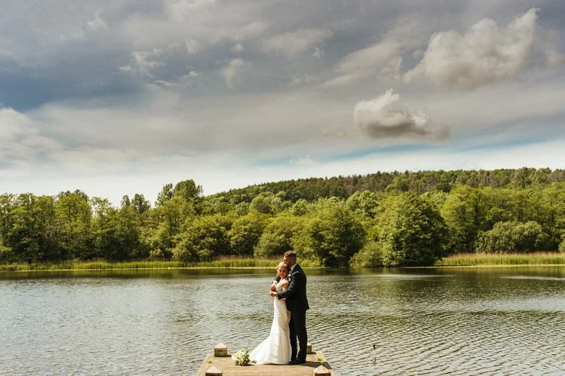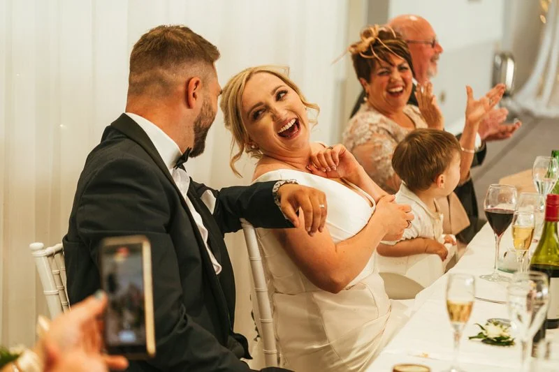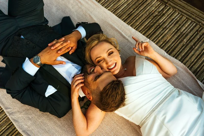 As golden hour hit, we couldn’t resist stealing the couple away one last time. We headed down to the pontoon and even got the drone up for some creative aerial shots—including one of Lucy and Sam lying head to head on the boardwalk. Were they a little tipsy by then? Maybe. Did it make the photos even better? Absolutely.