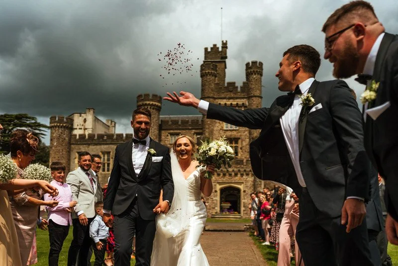Afterwards, everyone gathered on the lawn for a classic confetti shot in front of the castle’s dramatic façade, followed by a relaxed drinks reception.