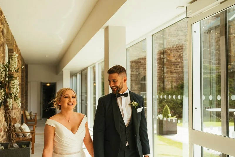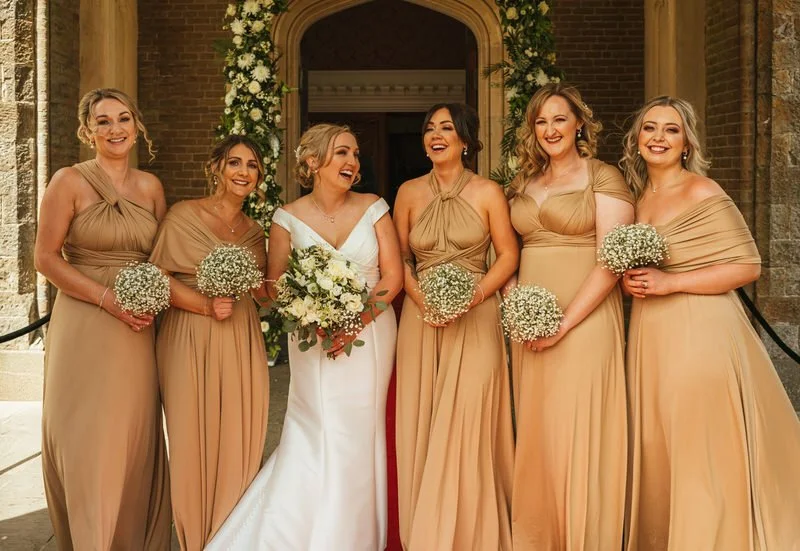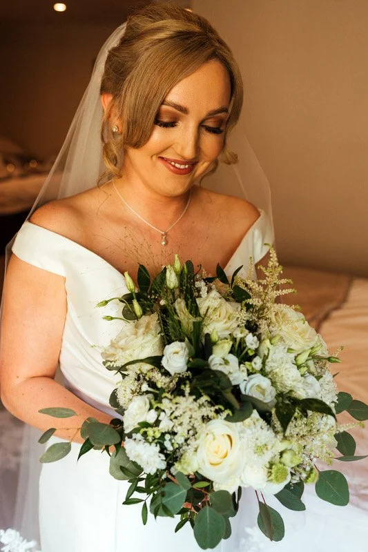 Lucy looked incredible in her gown from All About Eve Bridal Wear, a fitted off-shoulder design with a flared skirt and subtle train that gave her the most stunning silhouette on camera. Her elegant veil, soft updo, and flawless makeup by Kathryn Kift completed the look. Bridesmaids wore deep gold dresses and carried dainty gypsophila posies, while Lucy’s bouquet featured fresh whites and greenery.