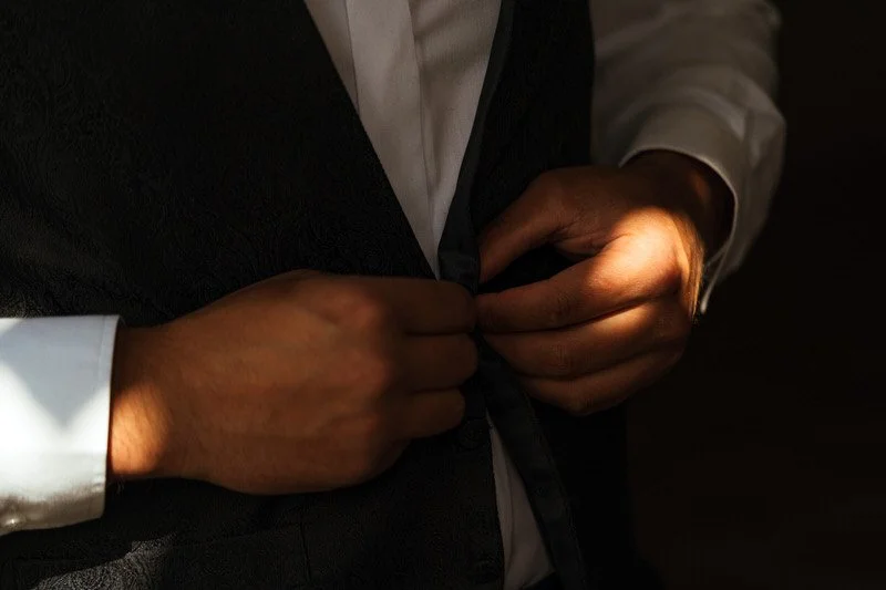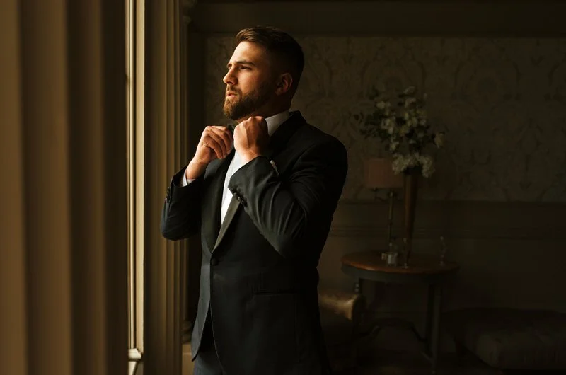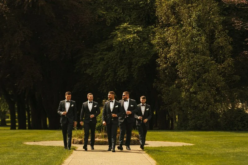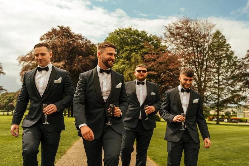 Meanwhile, over at the castle, we caught up with Sam and the groomsmen. They were relaxed, suited up in timeless black tie from Hanson, and clearly ready for the day. We captured them making their way through the castle grounds, looking effortlessly sharp.