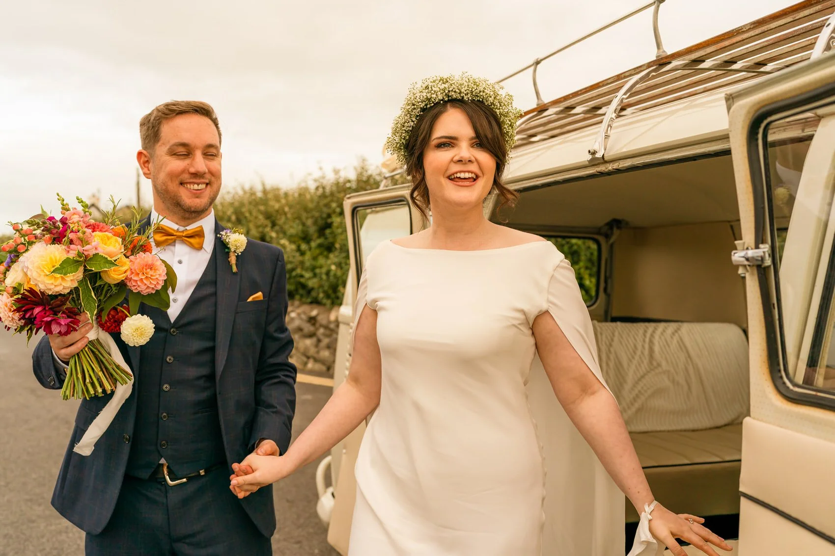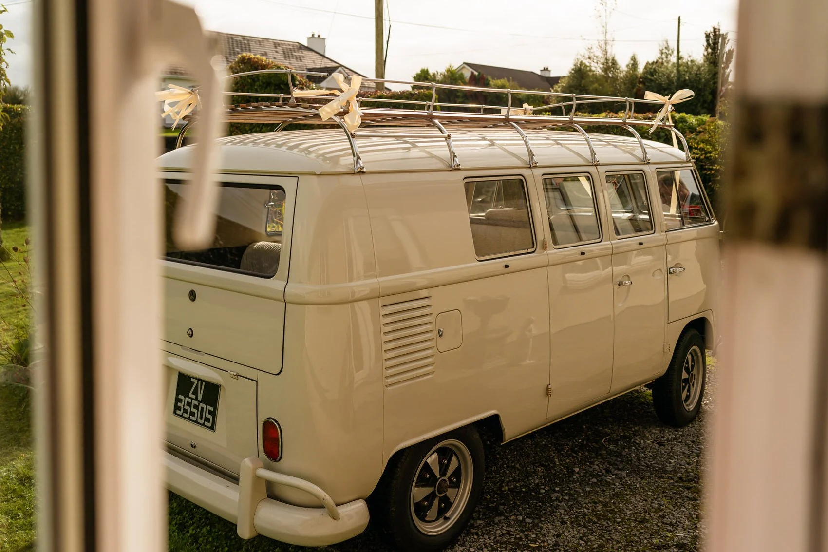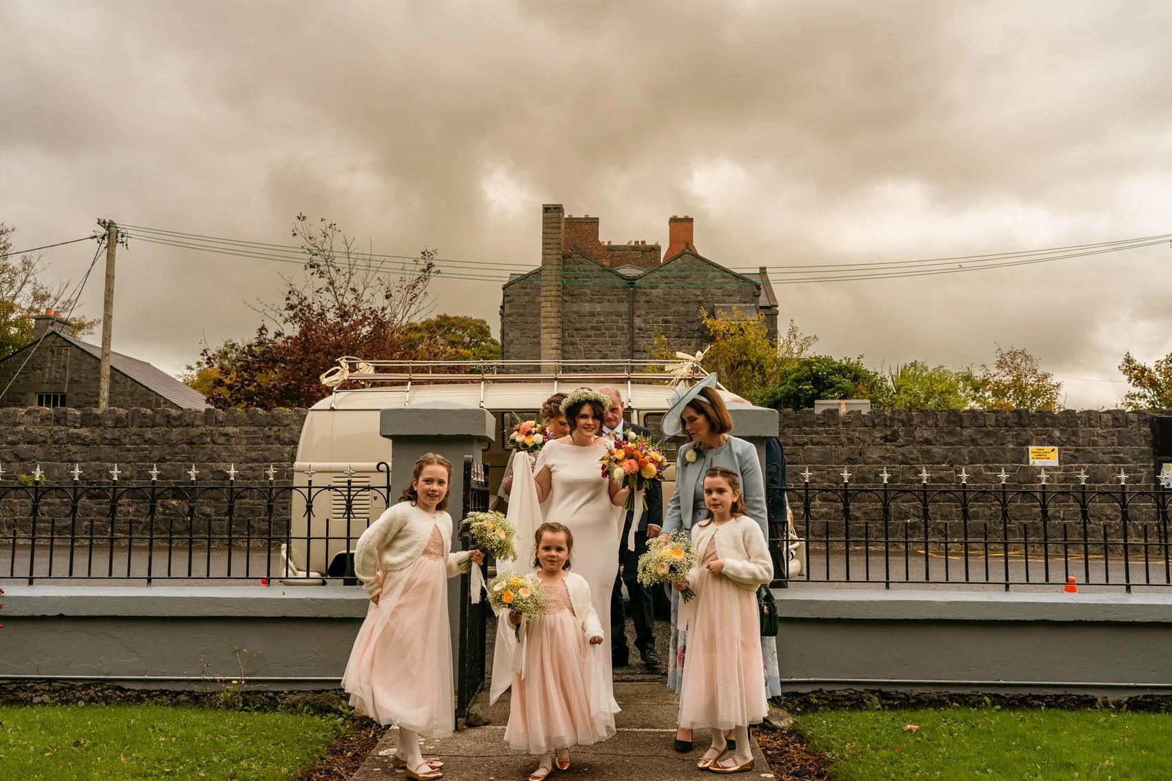 Niamh’s sister/maid of honour and mum both wore pale blue and looked so elegant. There were also three very sweet flower girls in rose gold. We got some great images of the bridal party before heading off to St Patrick’s Church for the wedding ceremony. With Niamh, her mum and dad and her sister travelling there is style in a gorgeous VW safari style campervan.