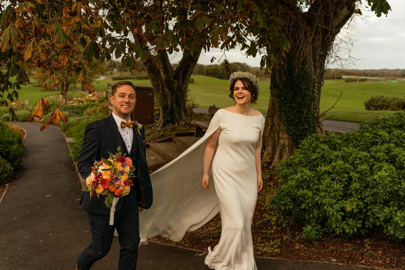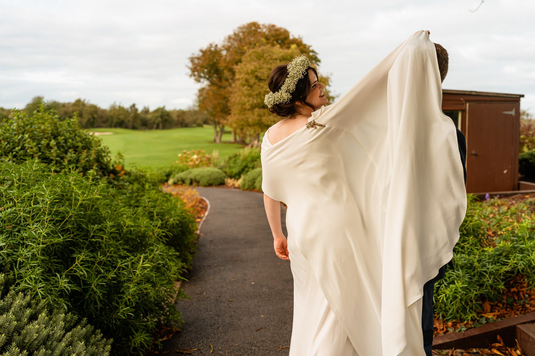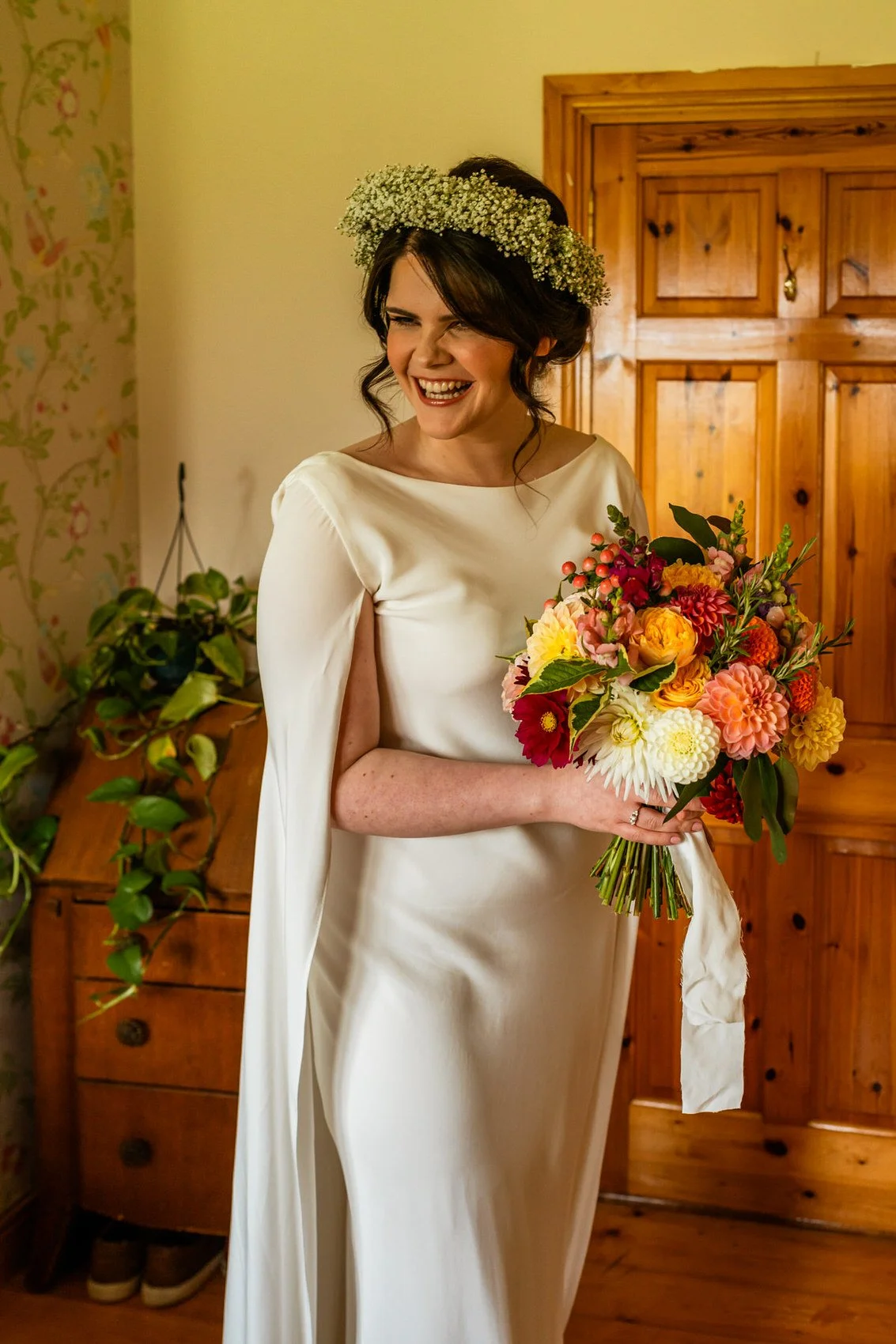 Niamh looked stunning in a simple yet striking dress with a sabrina neckline, low back and column shaped skirt that gently fanned out giving Niamh a stunning silhouette in all of my images. Though the crowning glory was a statement cape that added a touch grandeur to the dress. The look was complemented with a pretty gypsophila garland and a bouquet of gorgeous flowers with green foliage.