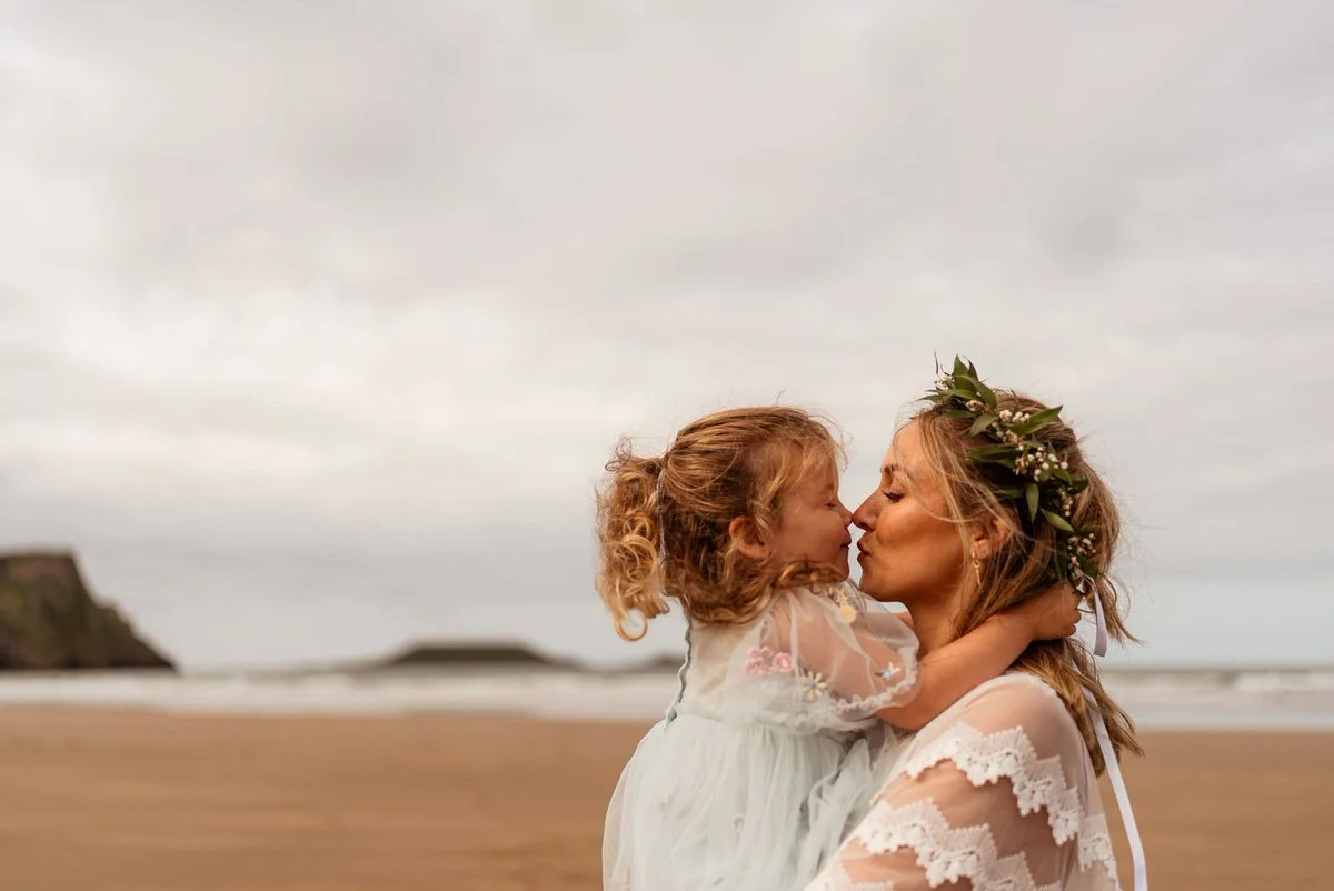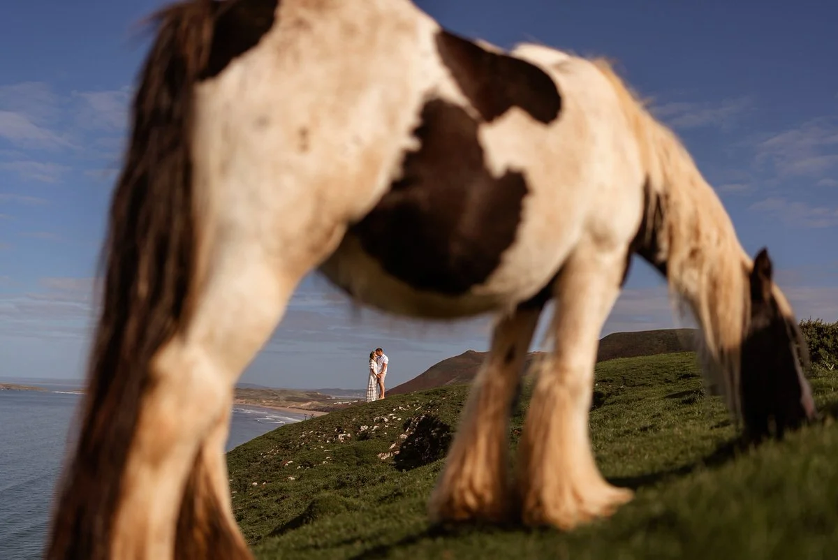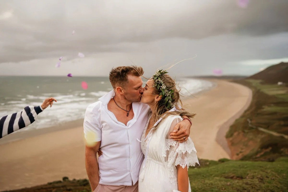 Frankie & Tom's elopement on the Gower coastline was nothing short of adventurous and windswept. Overlooking Worm’s Head and Rhossili Bay, they braved the remnants of hurricane Lee for their handfasting ceremony.