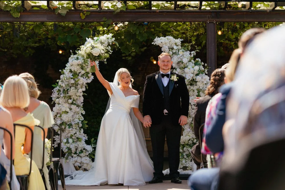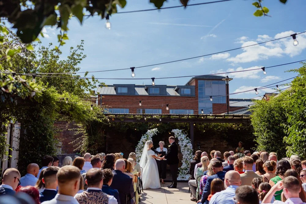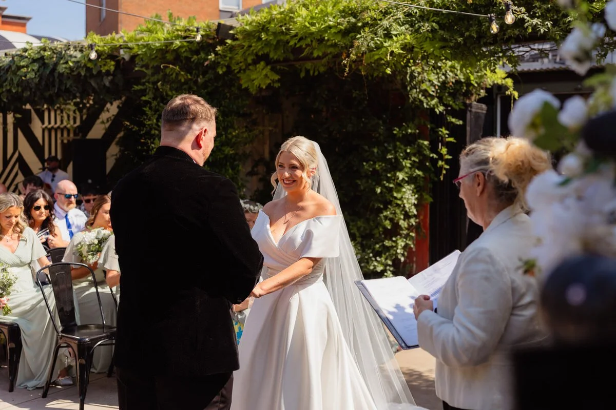 Their ceremony took place outside in the sunny courtyard, beneath a beautiful flower arch, with guests gathered around soaking up the relaxed, festival feel. Shack Revolution is perfect for couples who want an informal wedding venue with loads of visual interest and space to let the day flow naturally.