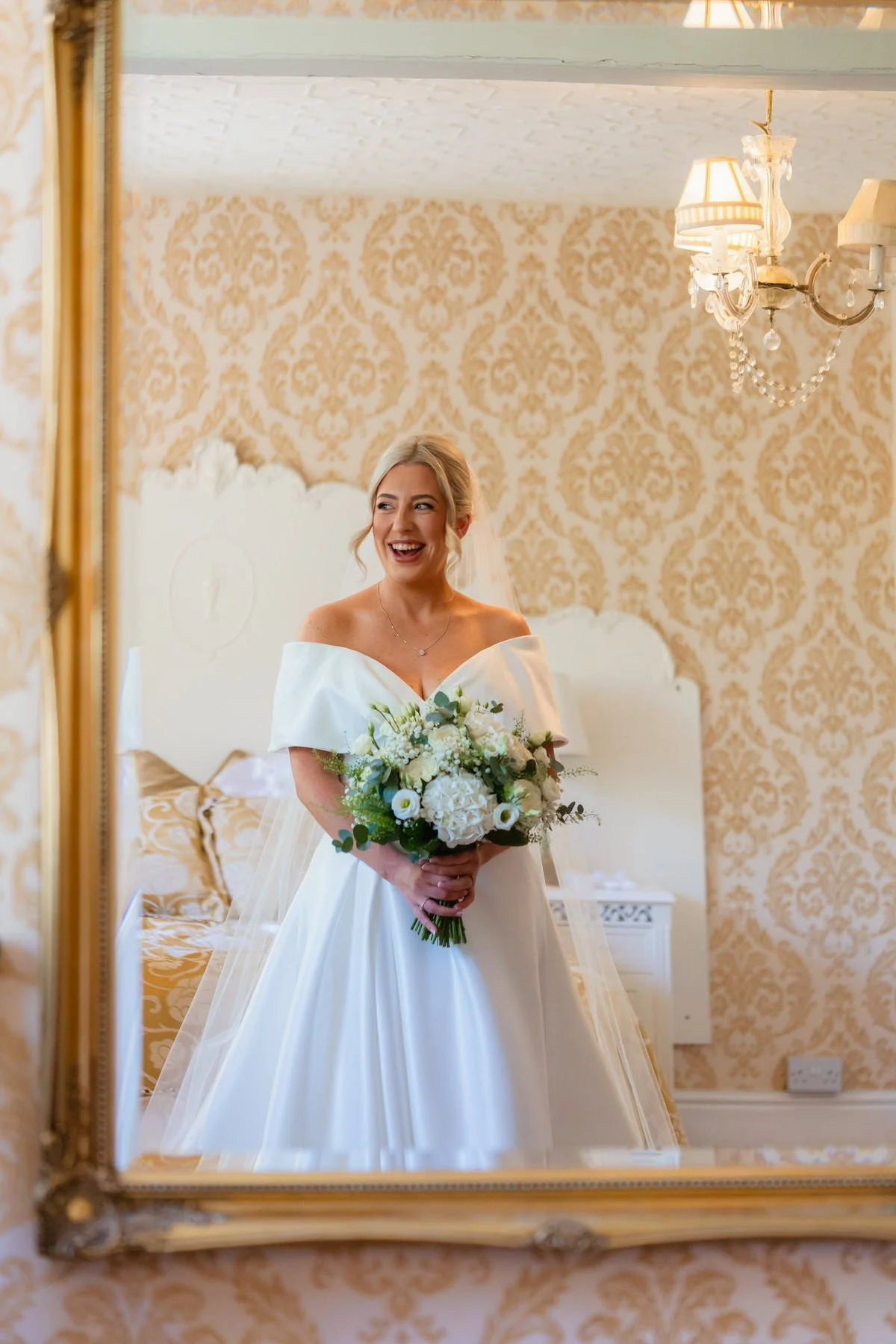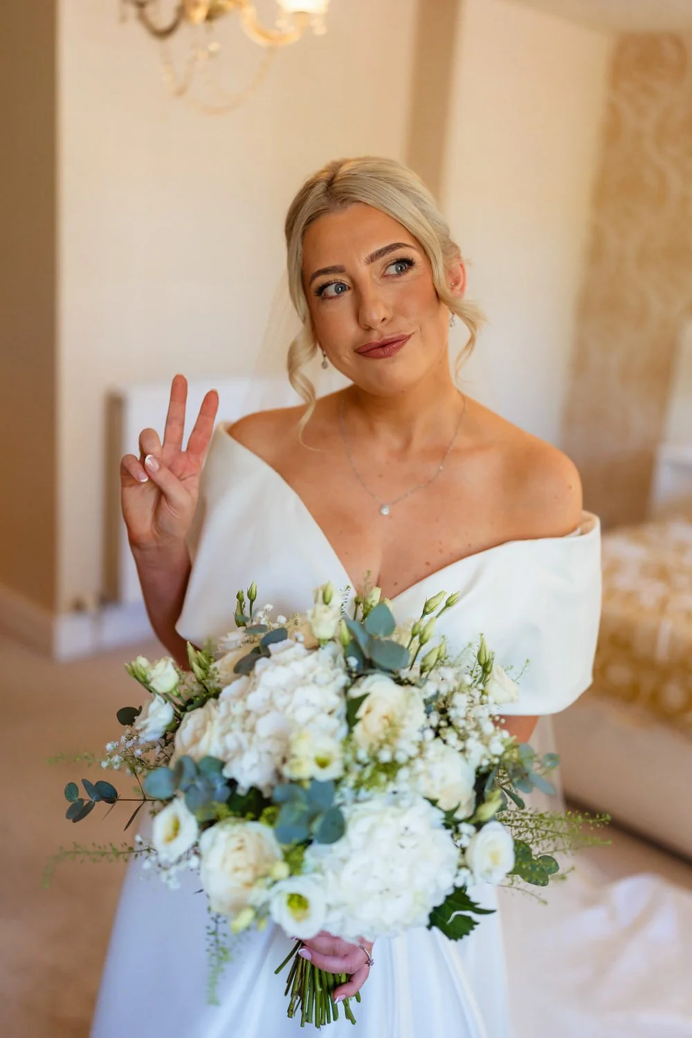Wedding morning prep took place at Aylestone Court Hotel, giving us a calm and light filled start to the day. Shona was already in full spirits, laughing throughout prep and flashing a peace sign every time the camera caught her eye. These moments set the tone for the entire wedding and made for some brilliant, natural photos and film.