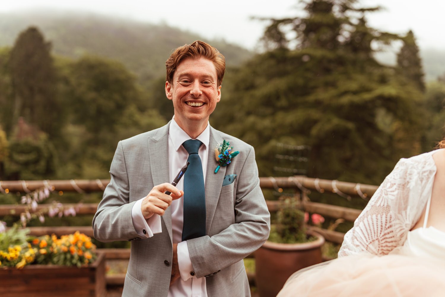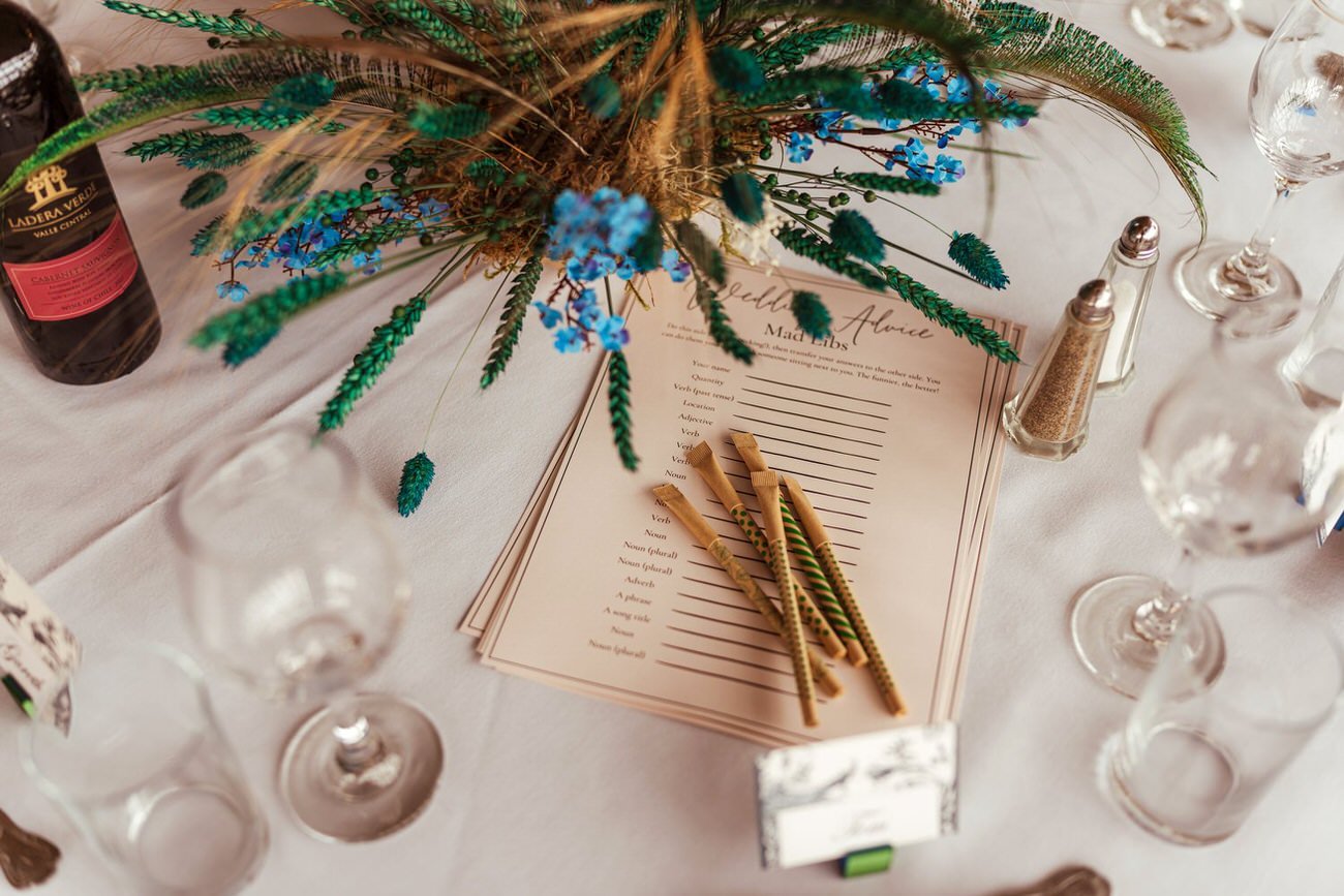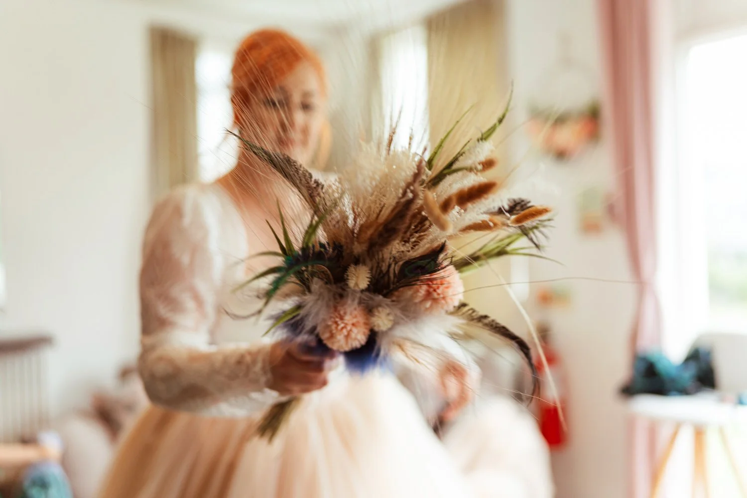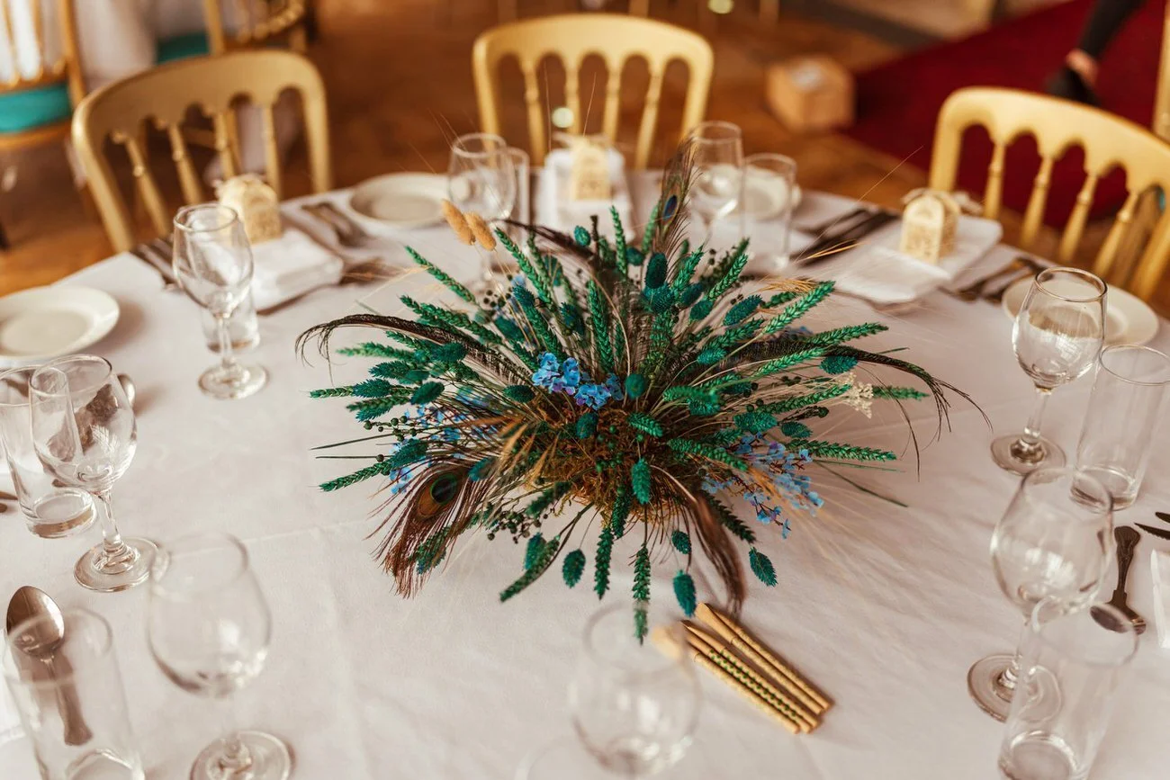 With Mel originally from the U.S., many of her family members traveled internationally to witness this destination wedding in Wales. Their peacock-themed color scheme perfectly complemented Mel’s boho bouquet of bunny tails, pampas grasses, and peacock feathers—a stunning contrast against the castle’s historic stone walls.