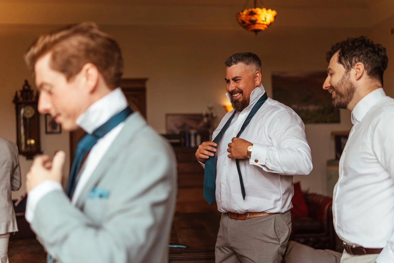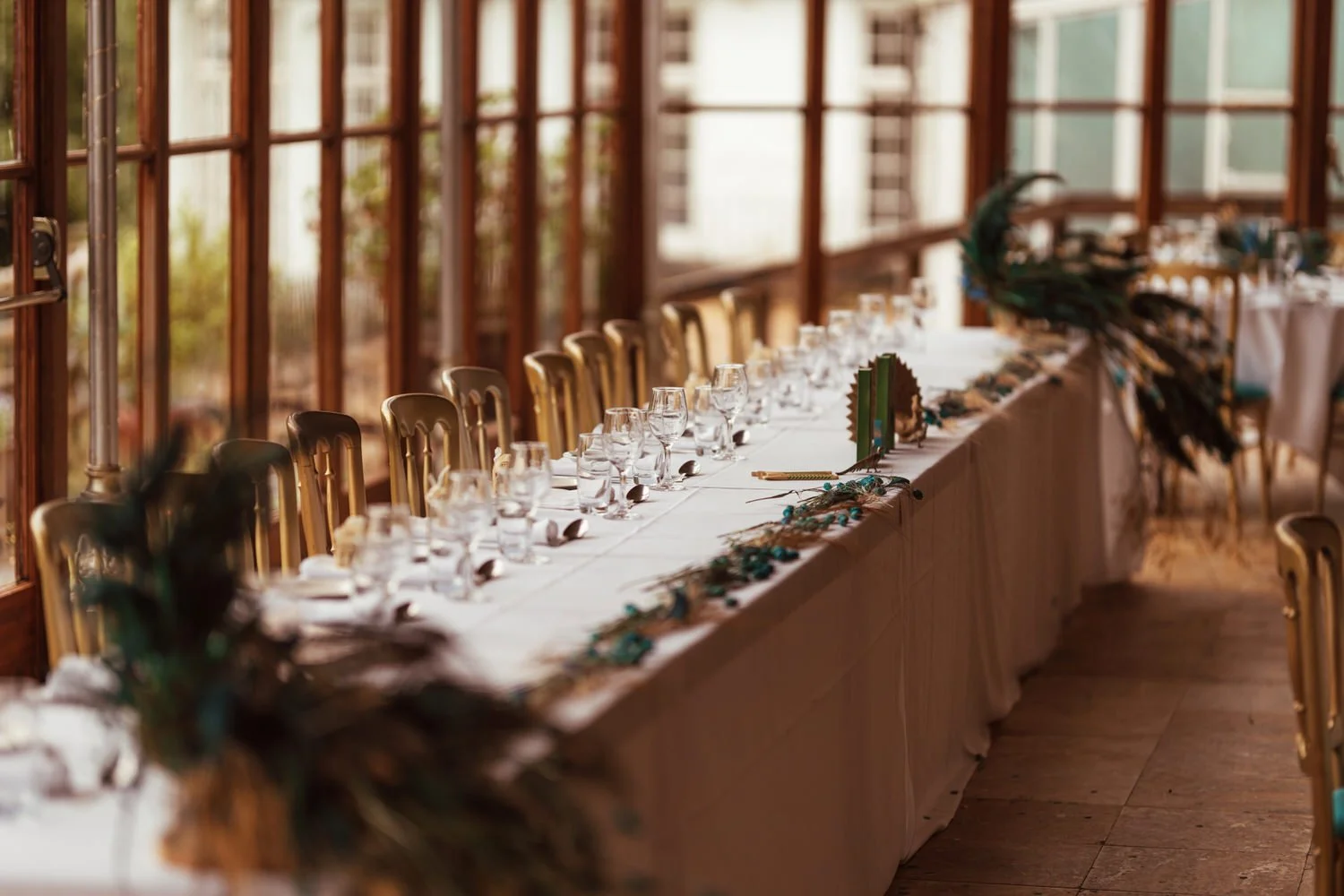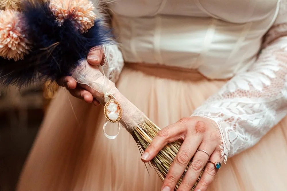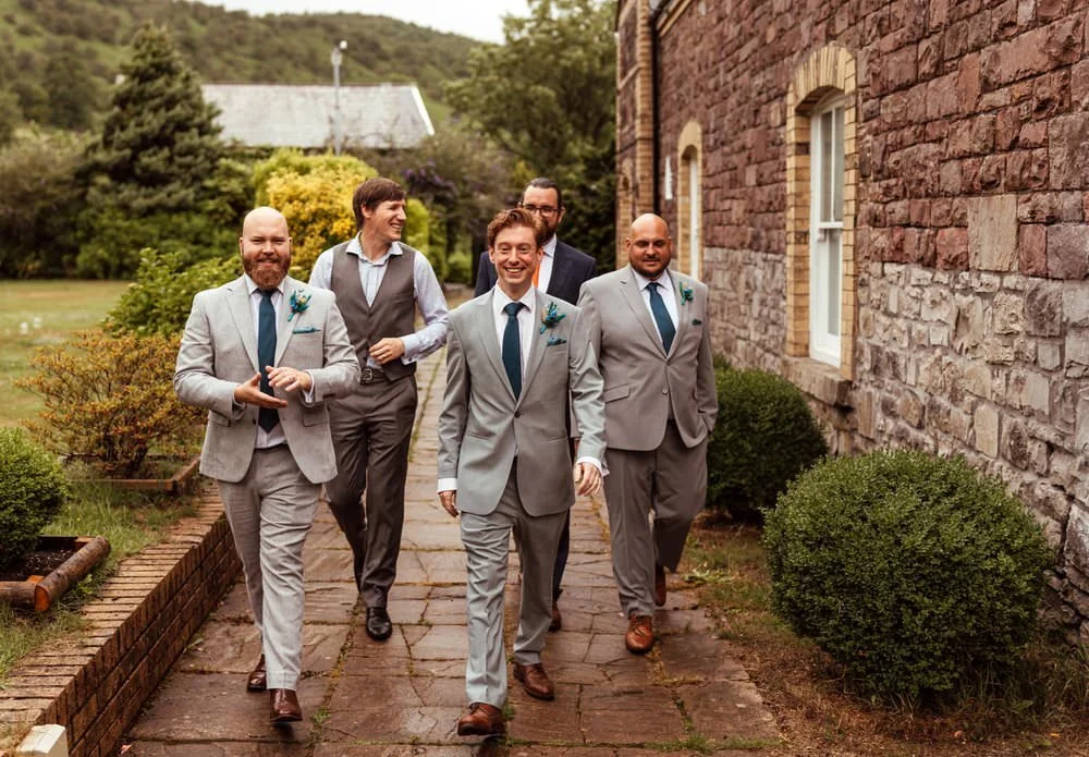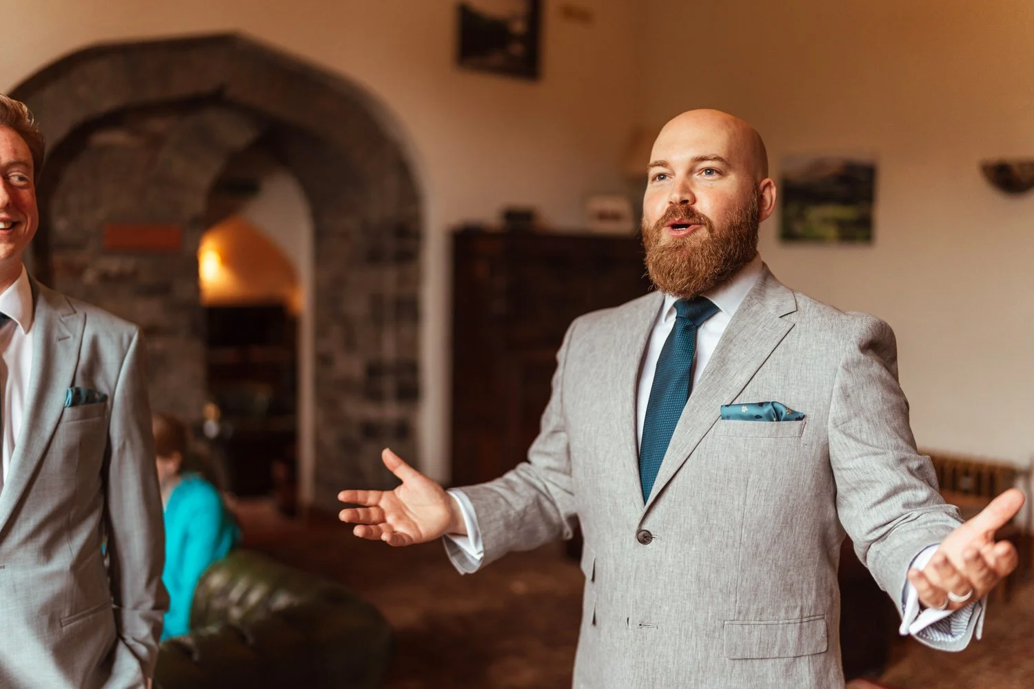 With Mel originally from the U.S., many of her family members traveled internationally to witness this destination wedding in Wales. Their peacock-themed color scheme perfectly complemented Mel’s boho bouquet of bunny tails, pampas grasses, and peacock feathers—a stunning contrast against the castle’s historic stone walls.