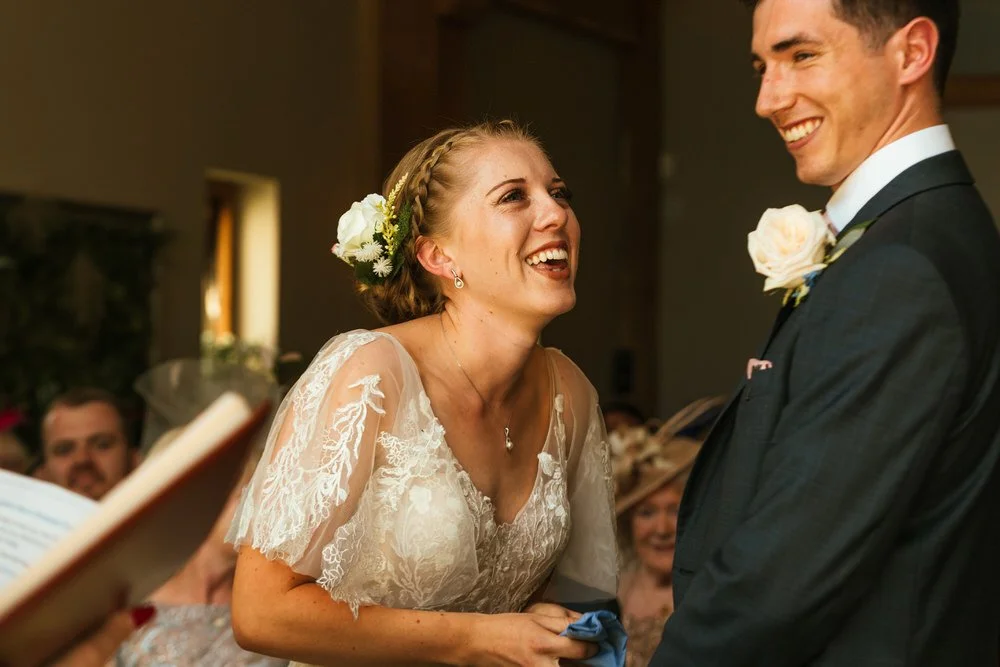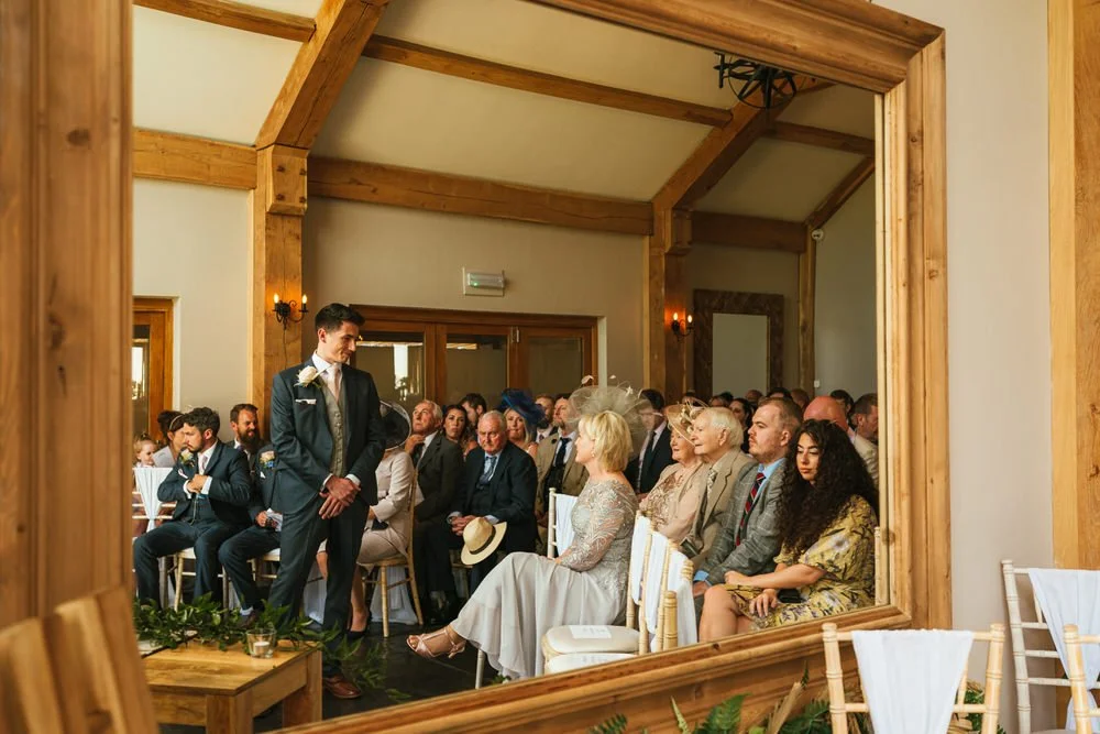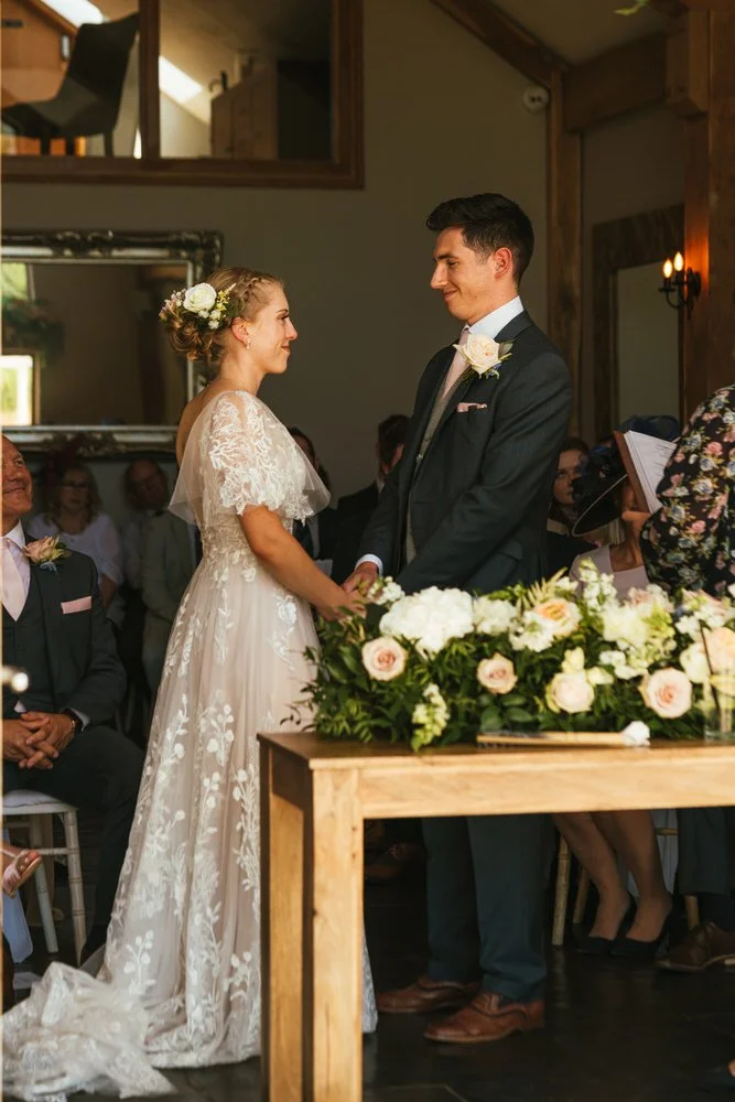 The wedding ceremony was held in Oldwalls Gower’s beautiful oak room. This charming and rustic space, has oak beams and feature ceiling to floor windows that provide beautiful views of the gardens. As well as, flooding the space with tons of natural light.