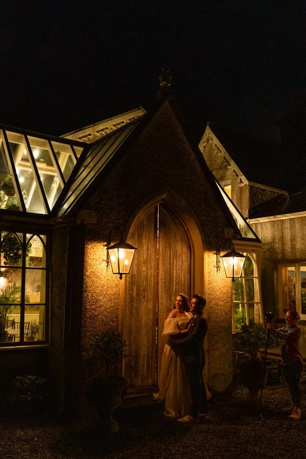 After the meal, as guests happily milled about, we whisked Charlotte and Alex outside for a couple of romantic images of them by the large oak doors lit up by two traditional Victorian wall lanterns. Parc Le Breos made a lovely backdrop lit up in the Autumn night photos.