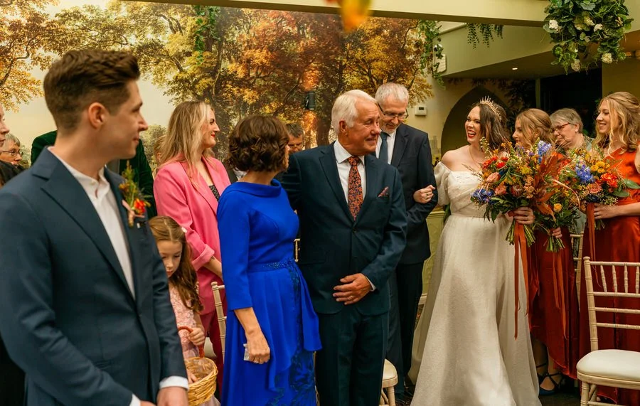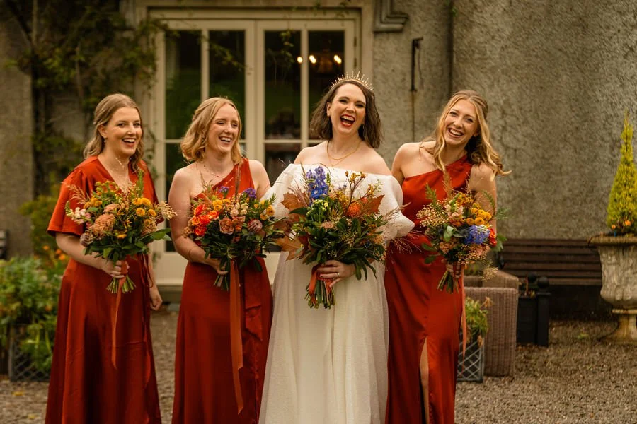 We loved the colour scheme of Charlotte and Alex’s wedding. They fully embraced autumn colours with beautiful bouquets of wildflowers, created by Sharon at Floral Innovations that complemented the bridesmaids rust satin dresses bought from Rewritten Bridesmaids perfectly.