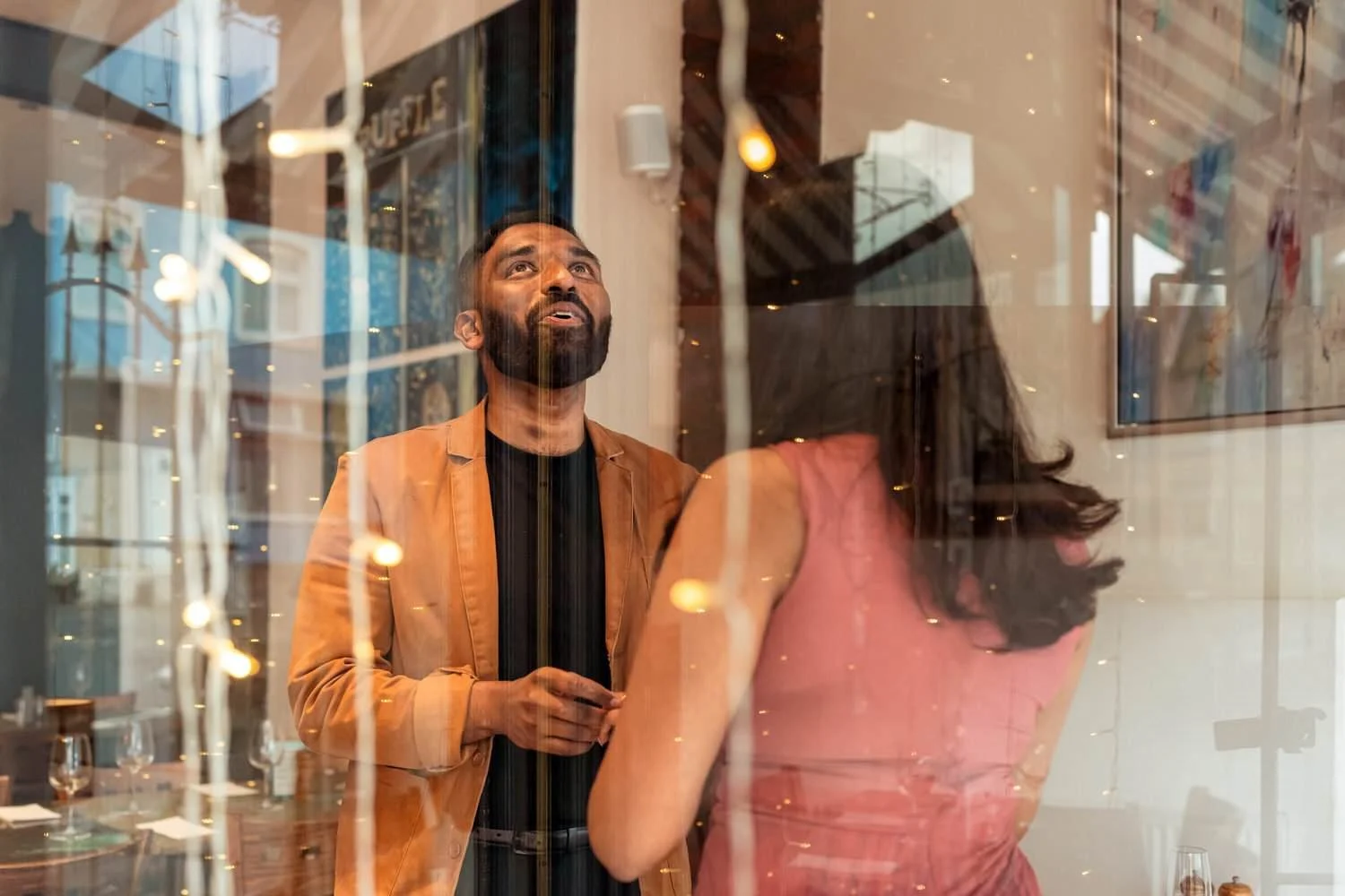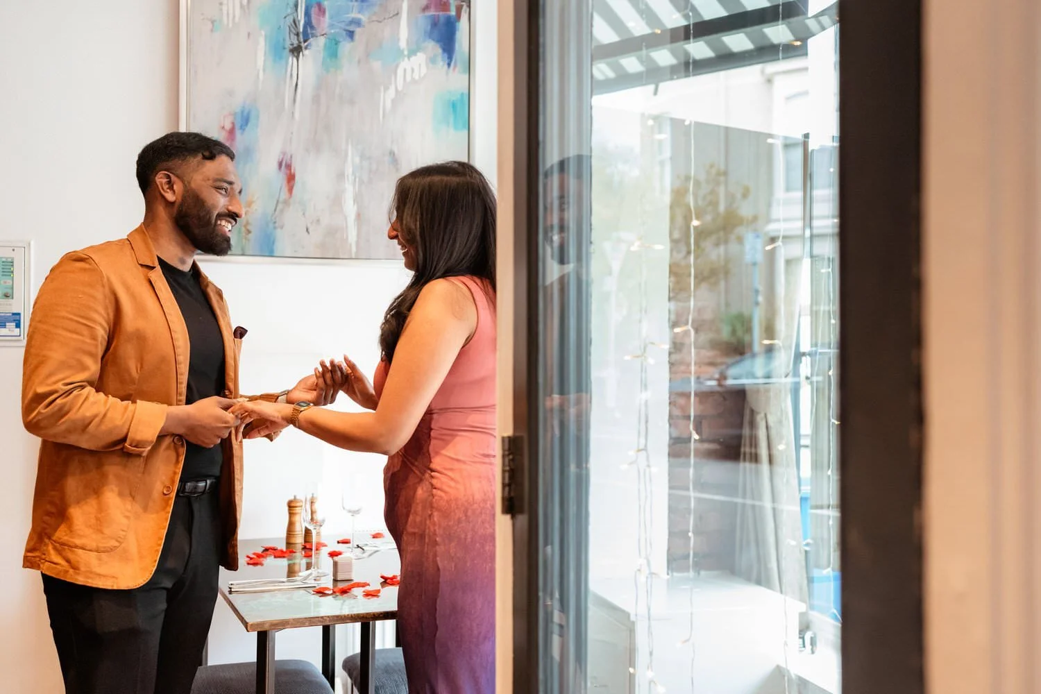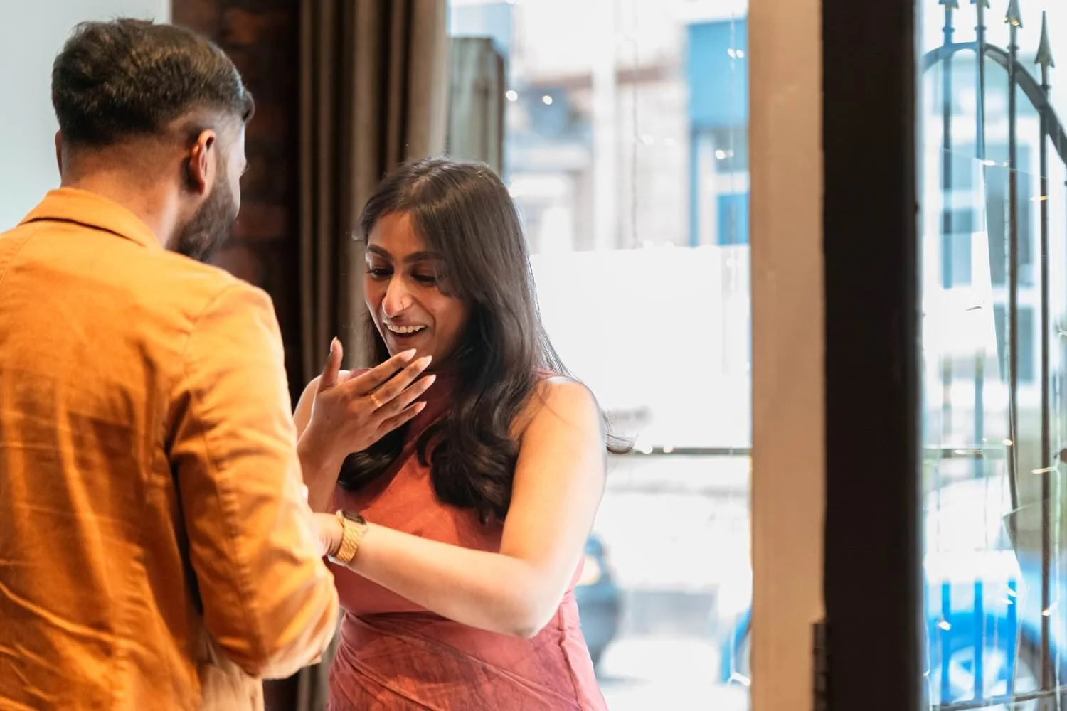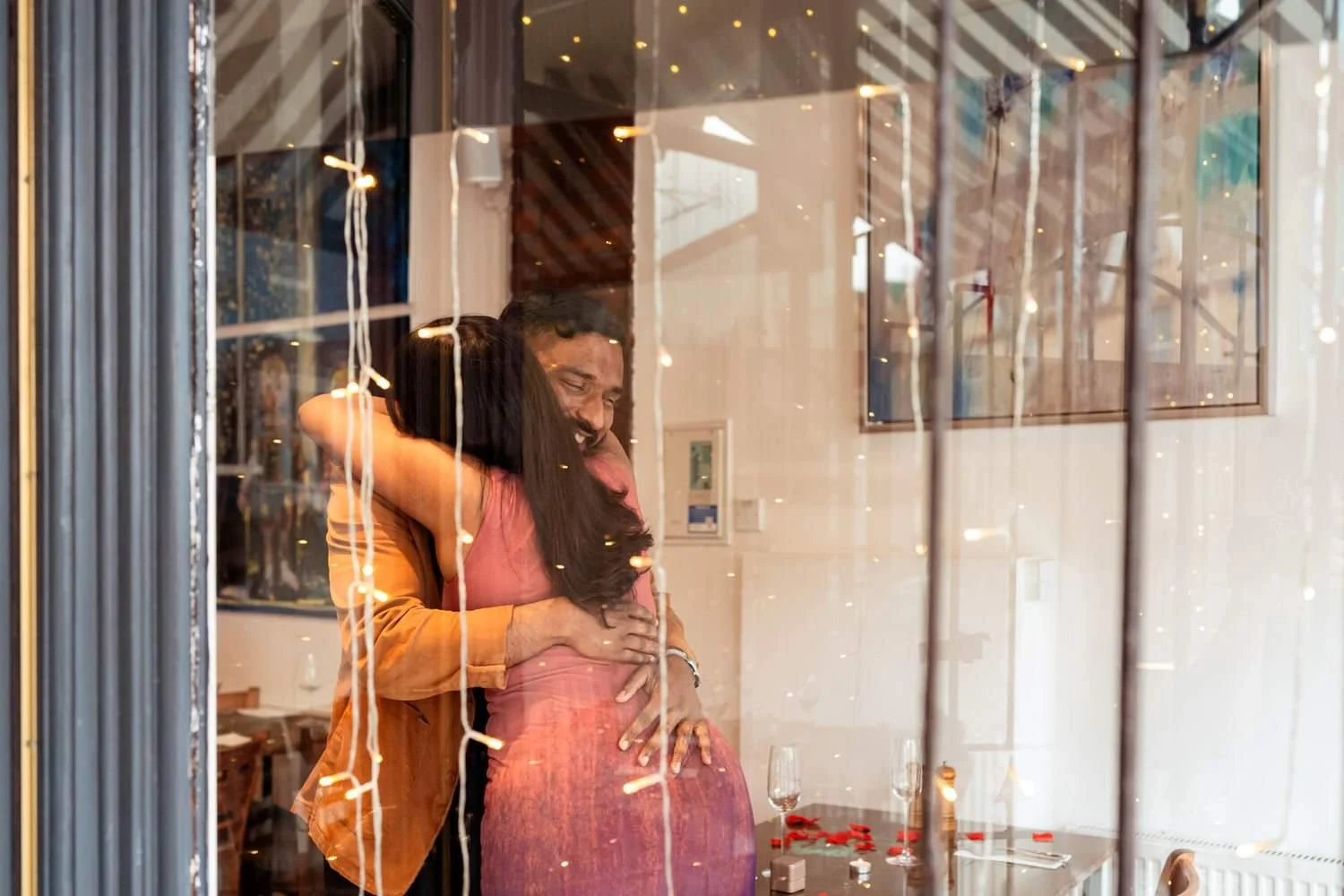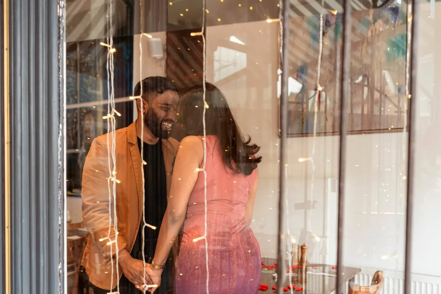 I (Amy) was incognito, camera in hand, capturing every moment. As Meenu walked in, she immediately noticed the romantic setup leading to their special table. Before she could process it—Menan was already down on one knee!