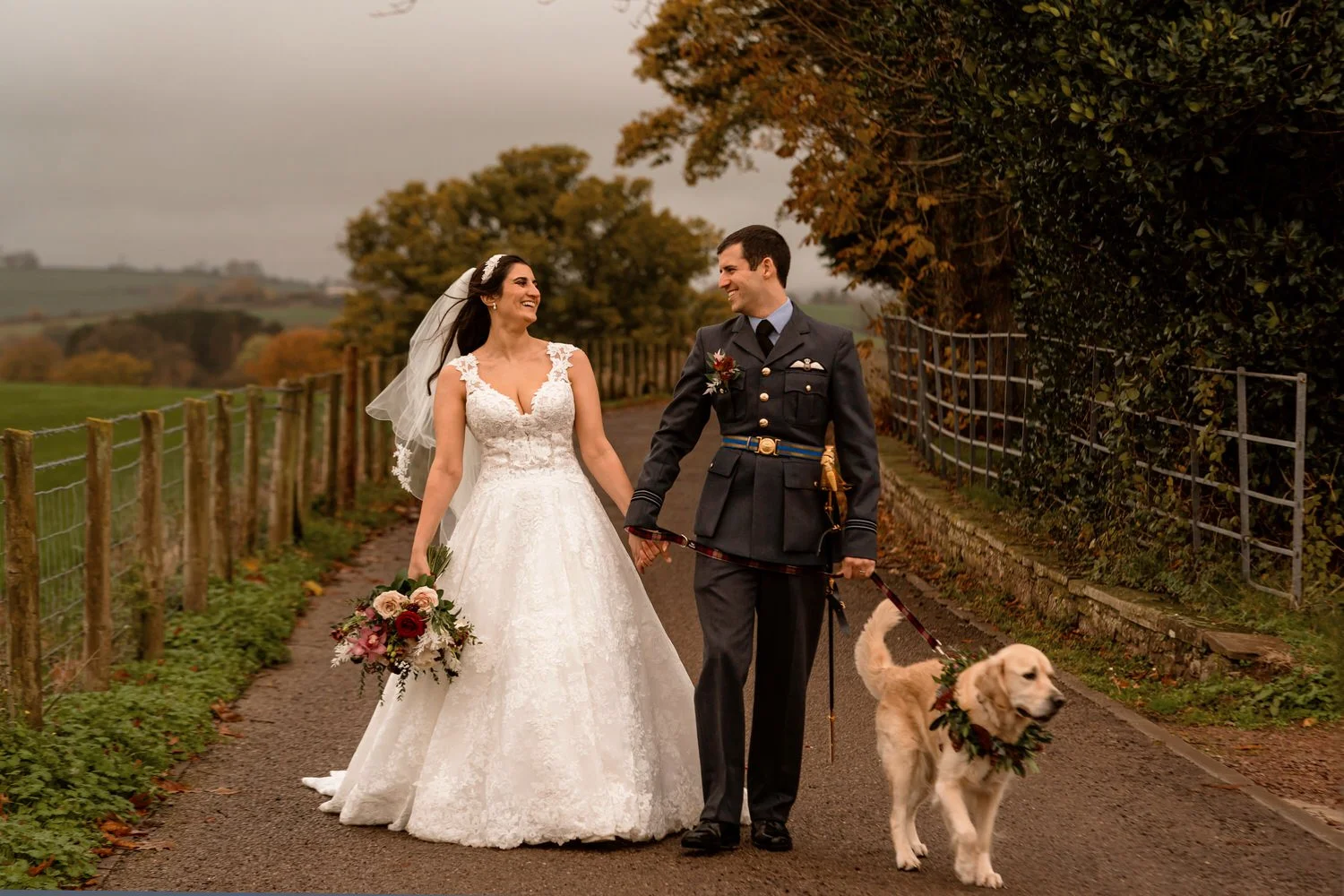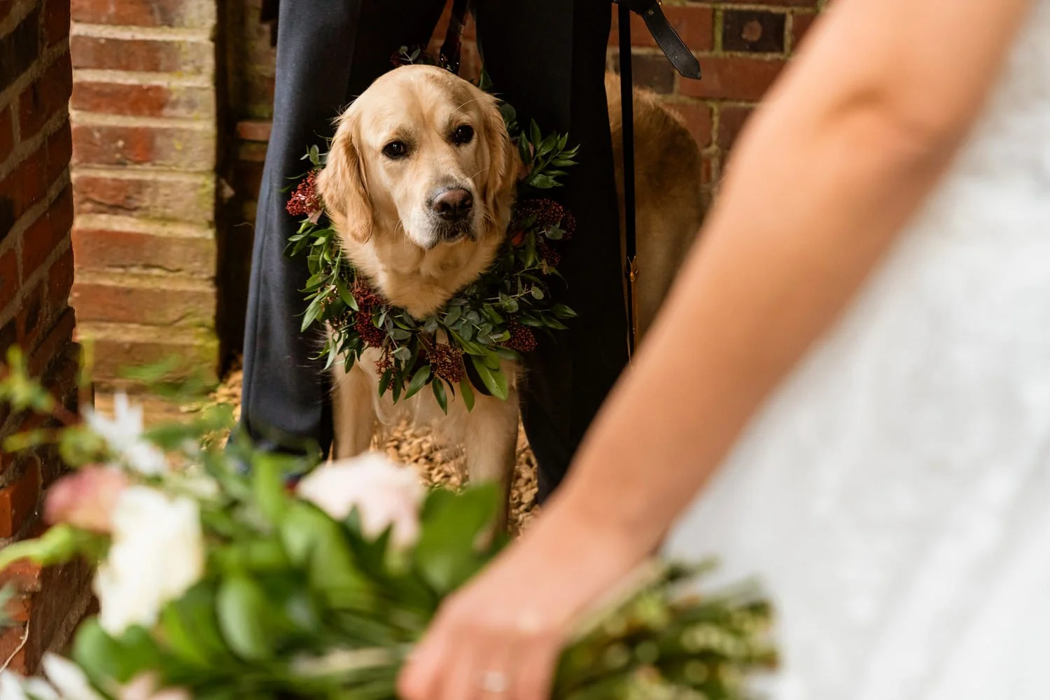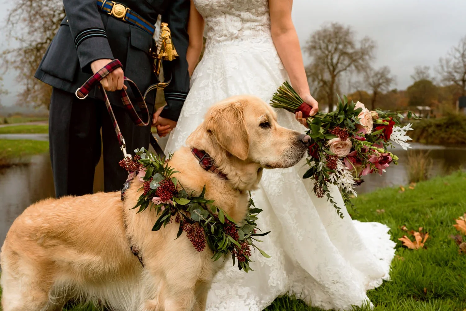 Sam and Nathan tied the knot with their beloved golden retriever, Bhuna, as the adorable four-legged guest of honor. Bhuna stole the show with a stunning floral garland, adding a touch of whimsy to the celebration. The flowers a mix of deep burgundy, green and blush made up by Hillary’s Floral Design in Abergavenny.