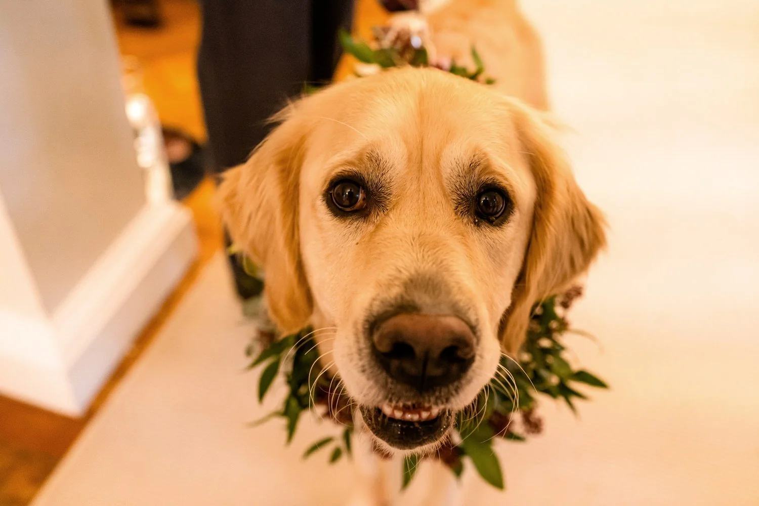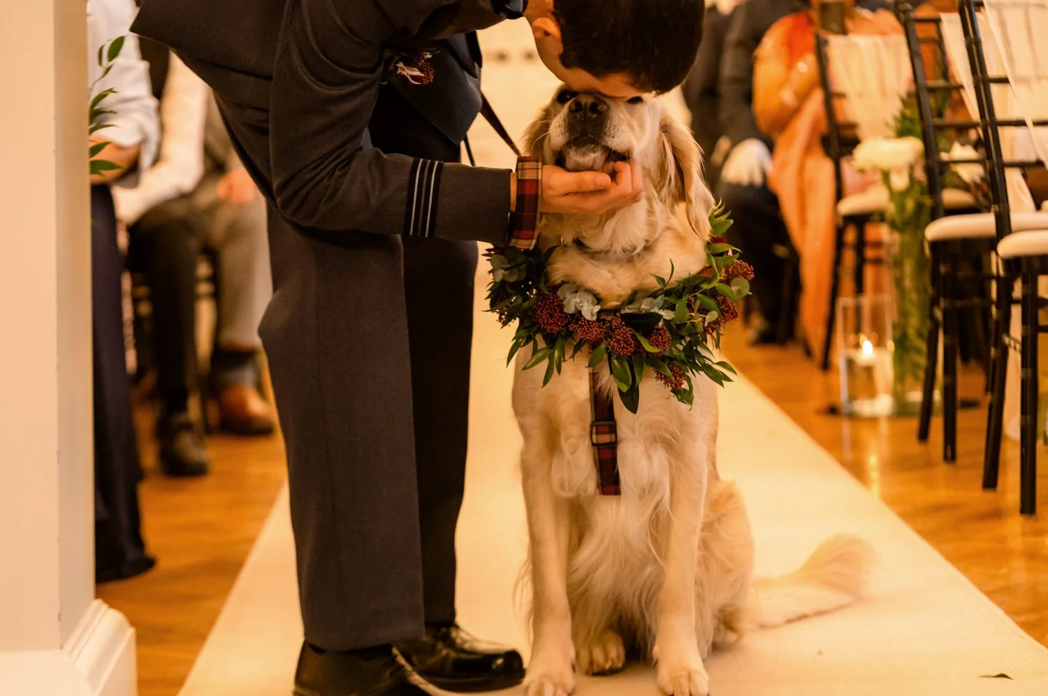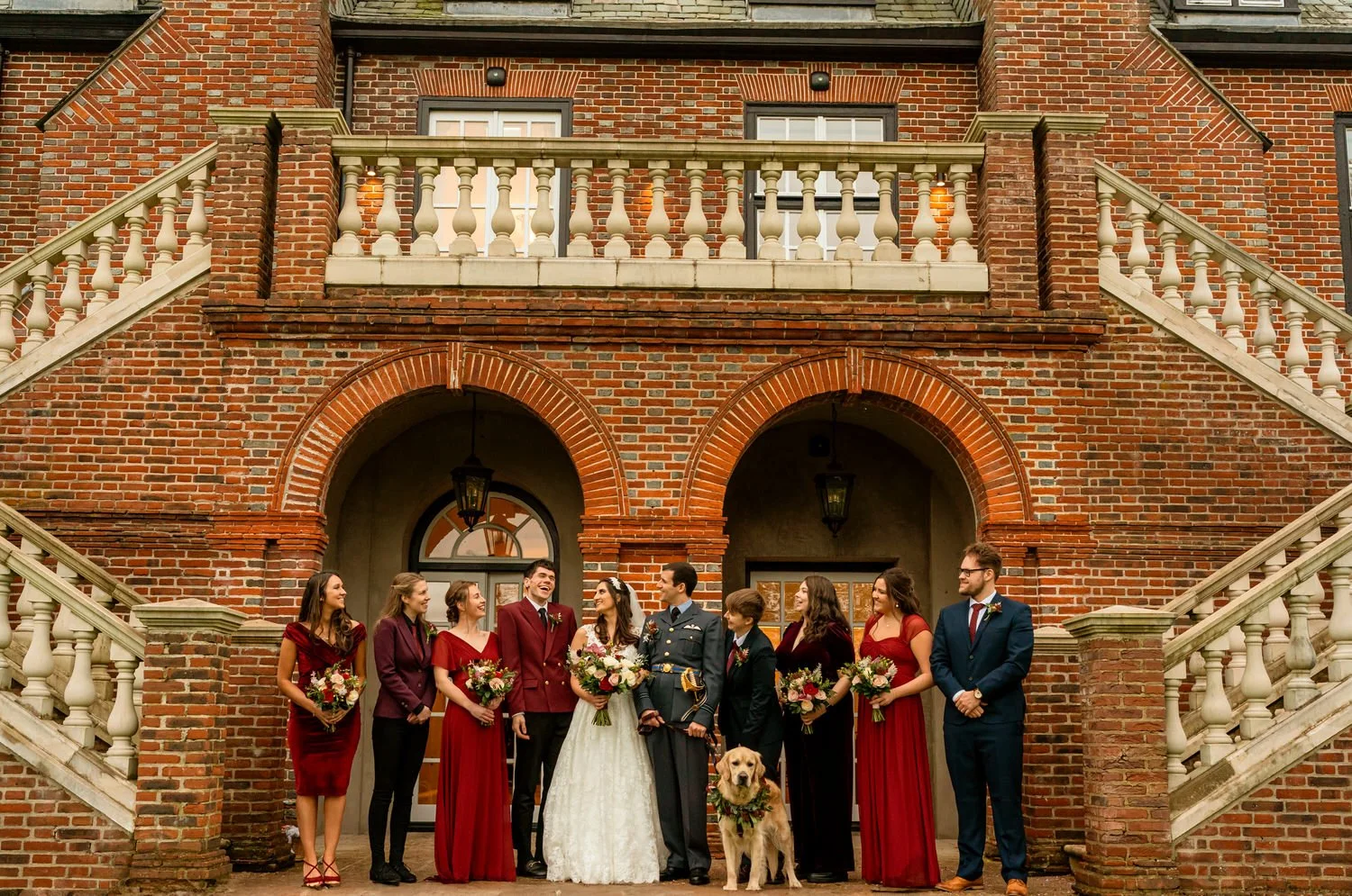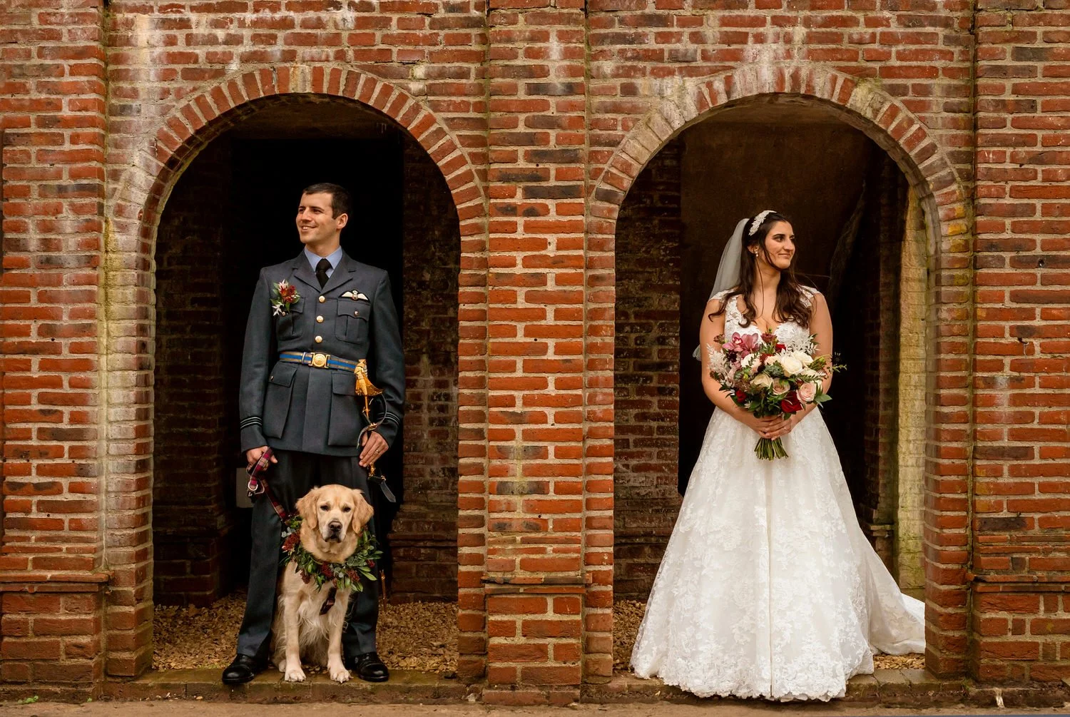 Sam and Nathan tied the knot with their beloved golden retriever, Bhuna, as the adorable four-legged guest of honor. Bhuna stole the show with a stunning floral garland, adding a touch of whimsy to the celebration. The flowers a mix of deep burgundy, green and blush made up by Hillary’s Floral Design in Abergavenny.