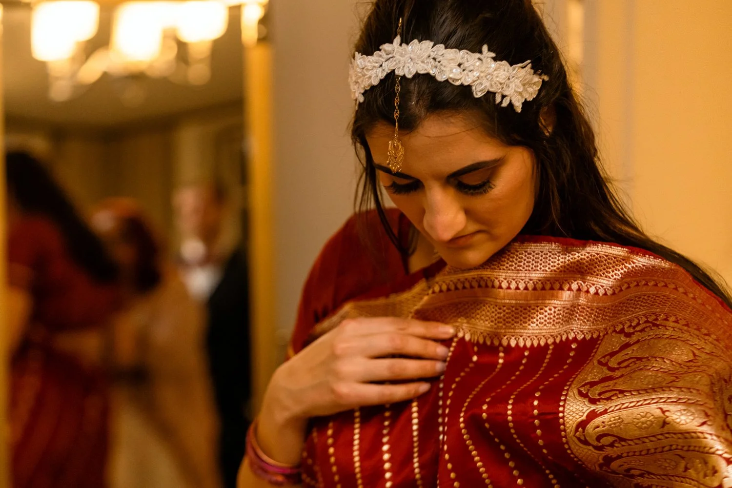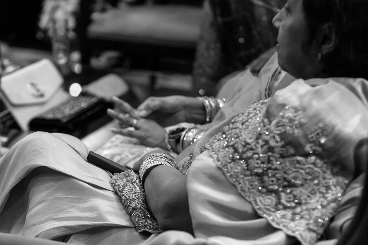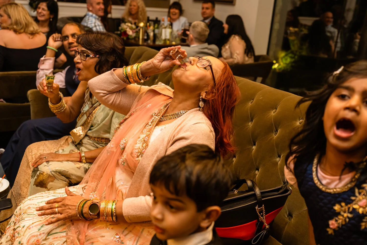 Samantha surprised guests by changing into a gorgeous Indian Sari to honor her relatives in India. The vibrant colors and intricate details of the ensemble, combined with the presence of aunties in layers of silk and bangles, brought a festive atmosphere to the event and an ease to photograph.