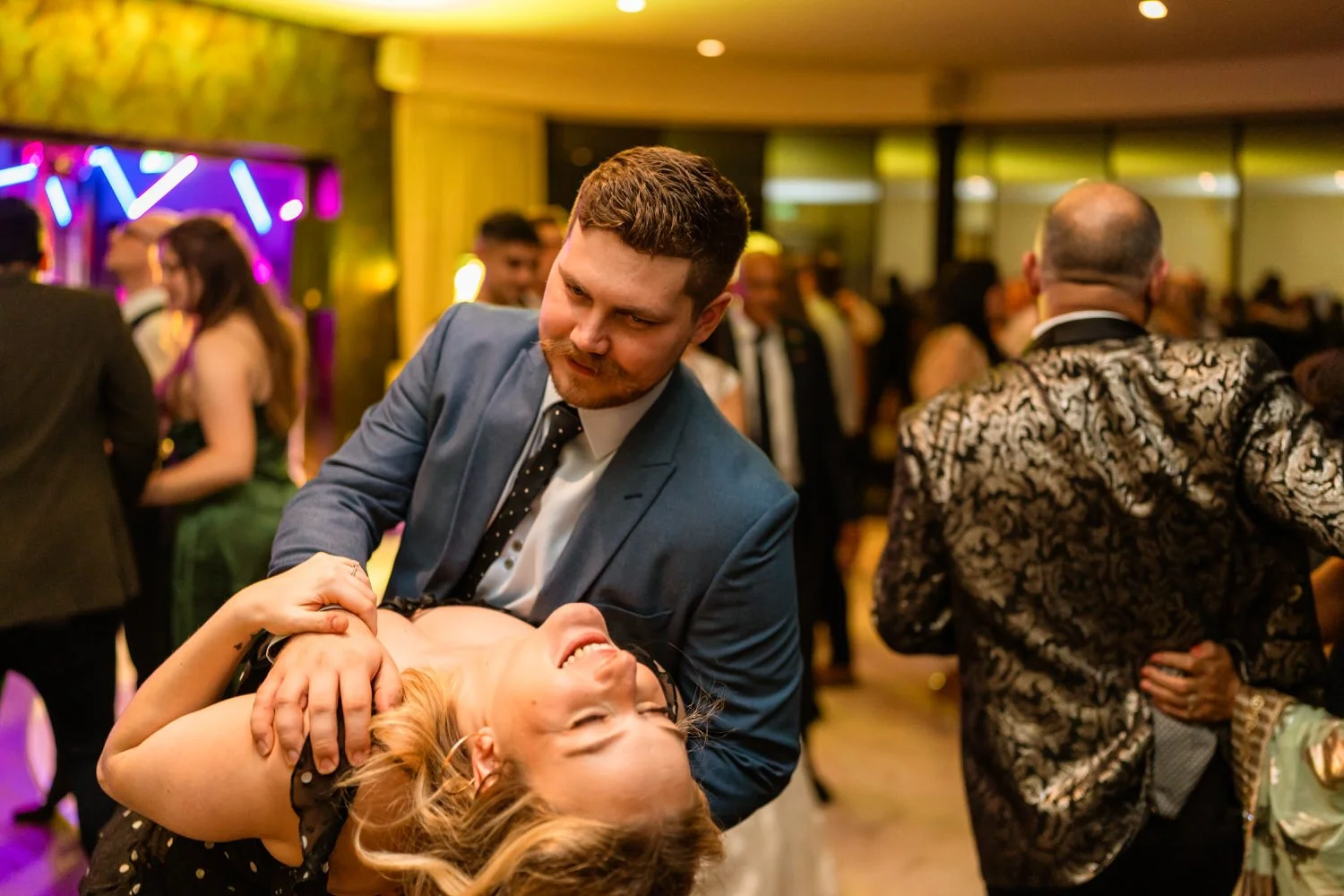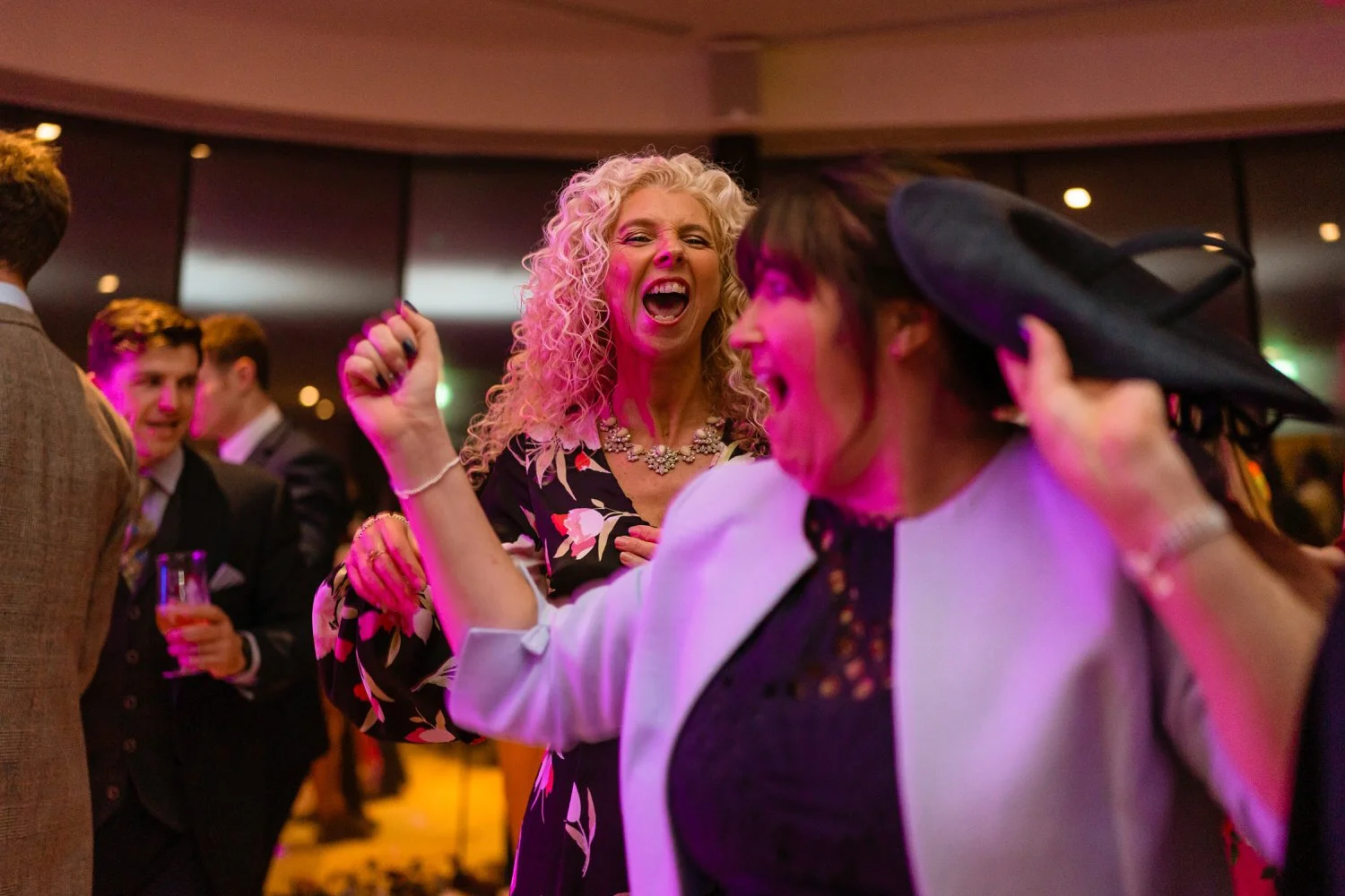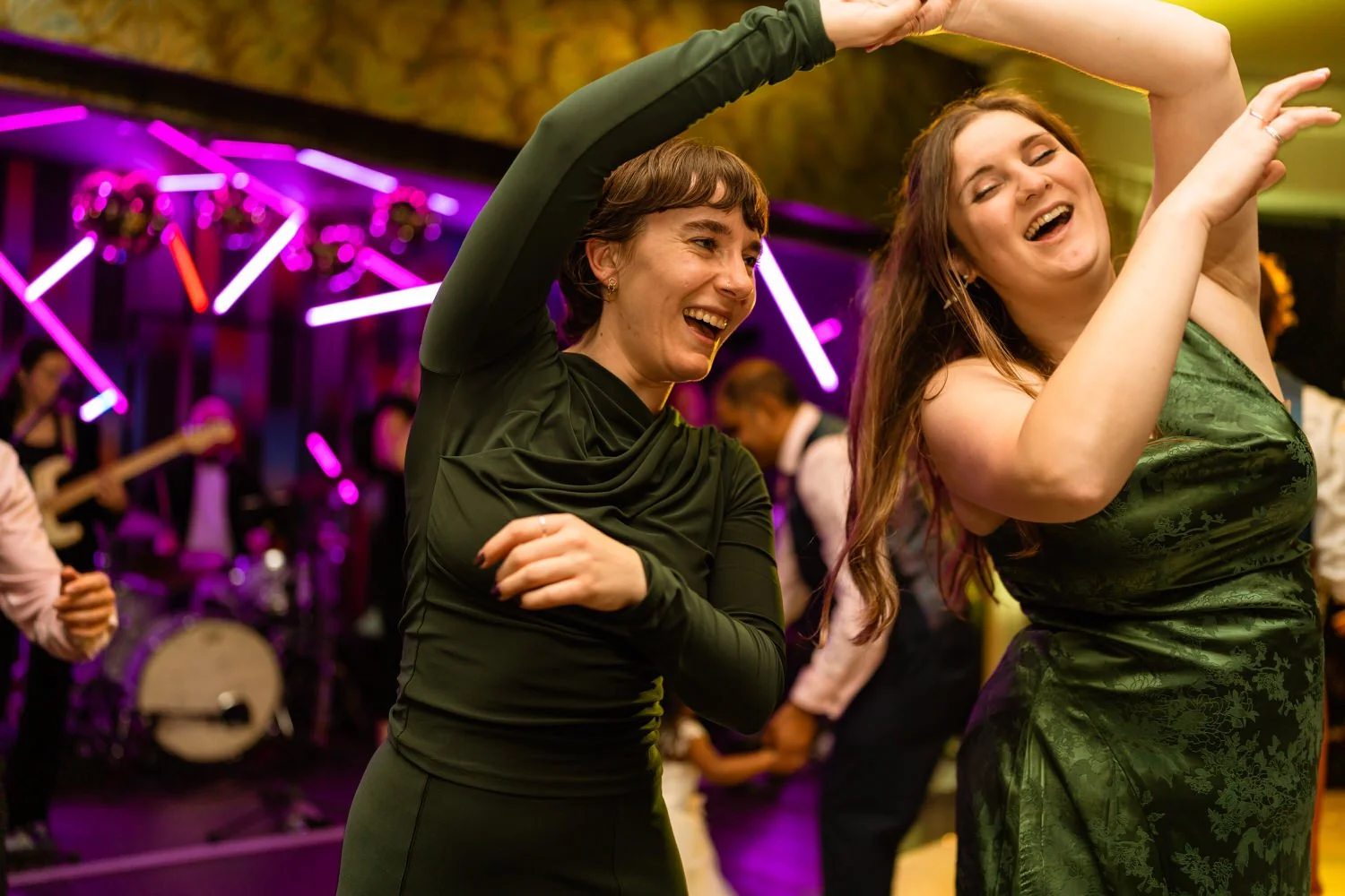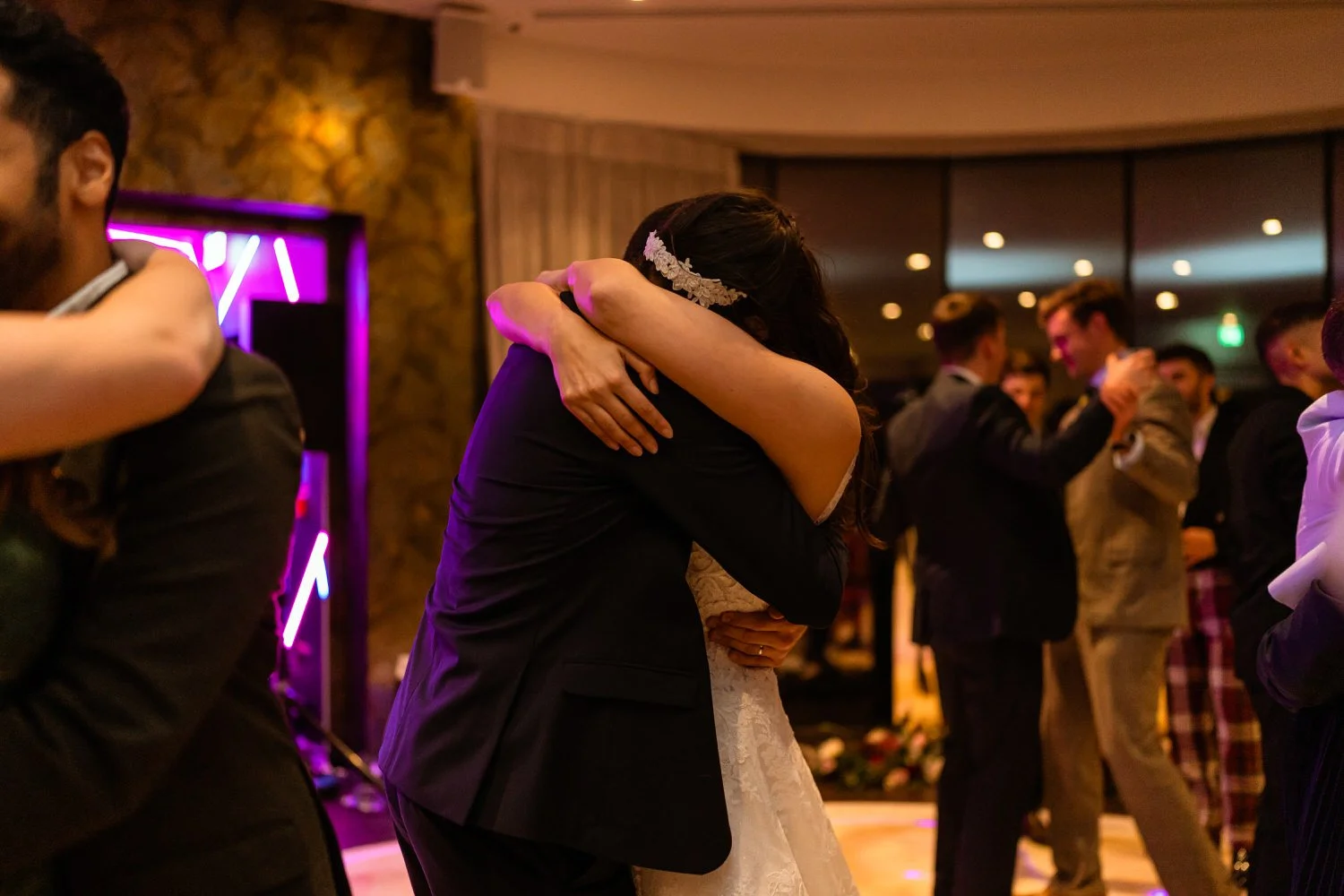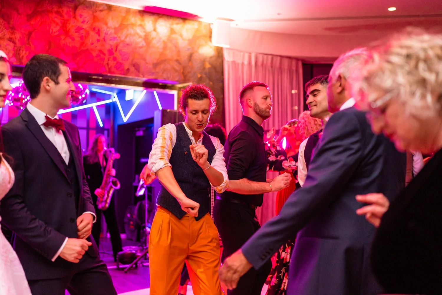 After the first dance, the band Velvet Soul took the stage, and soon everyone joined in the celebration. The neon lighting background at Sant Ffraed makes for great dance-floor photographs. The wedding turned from a fun celebration into a lively party, with no lull in the dance moves being thrown across the K room.