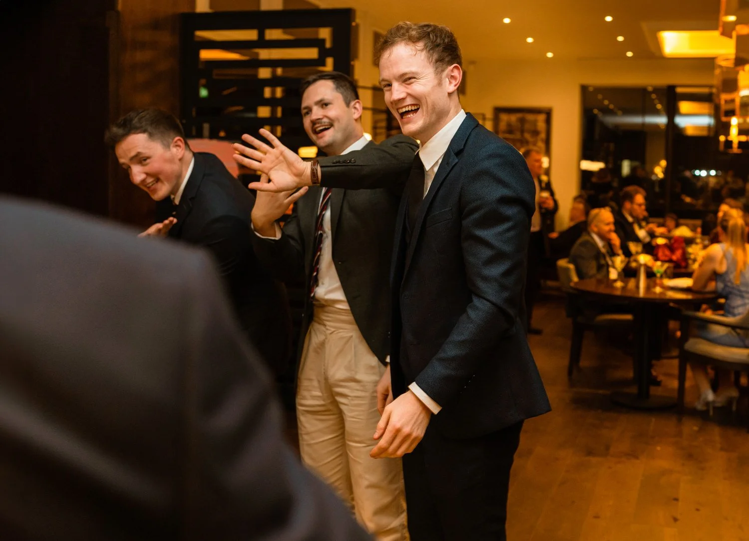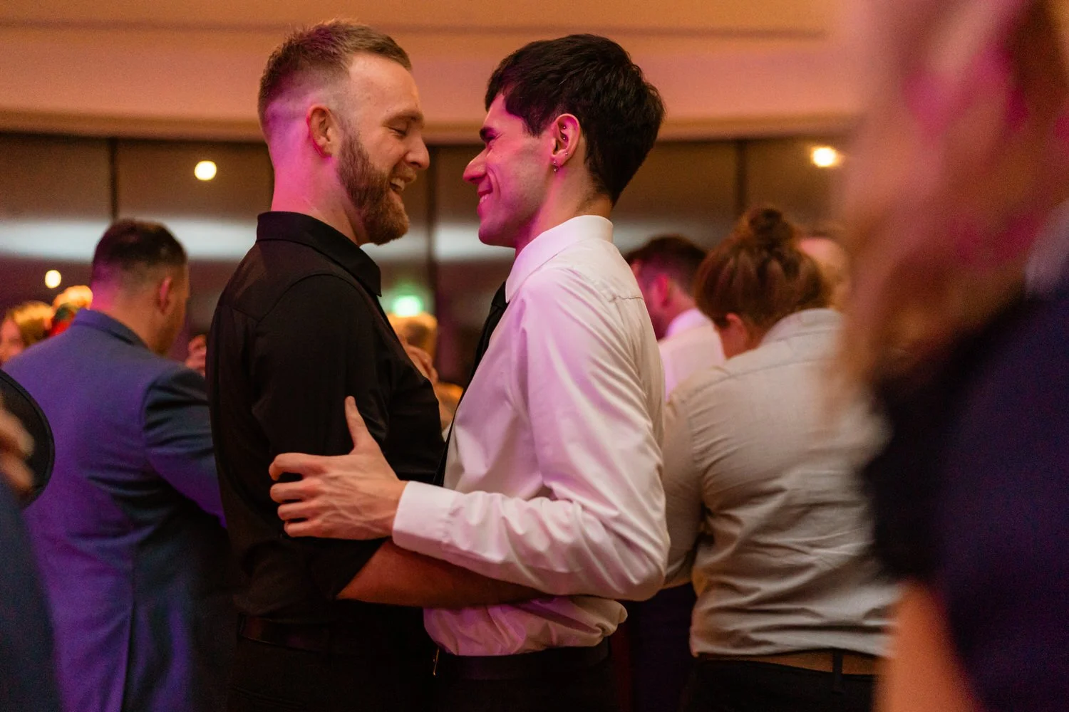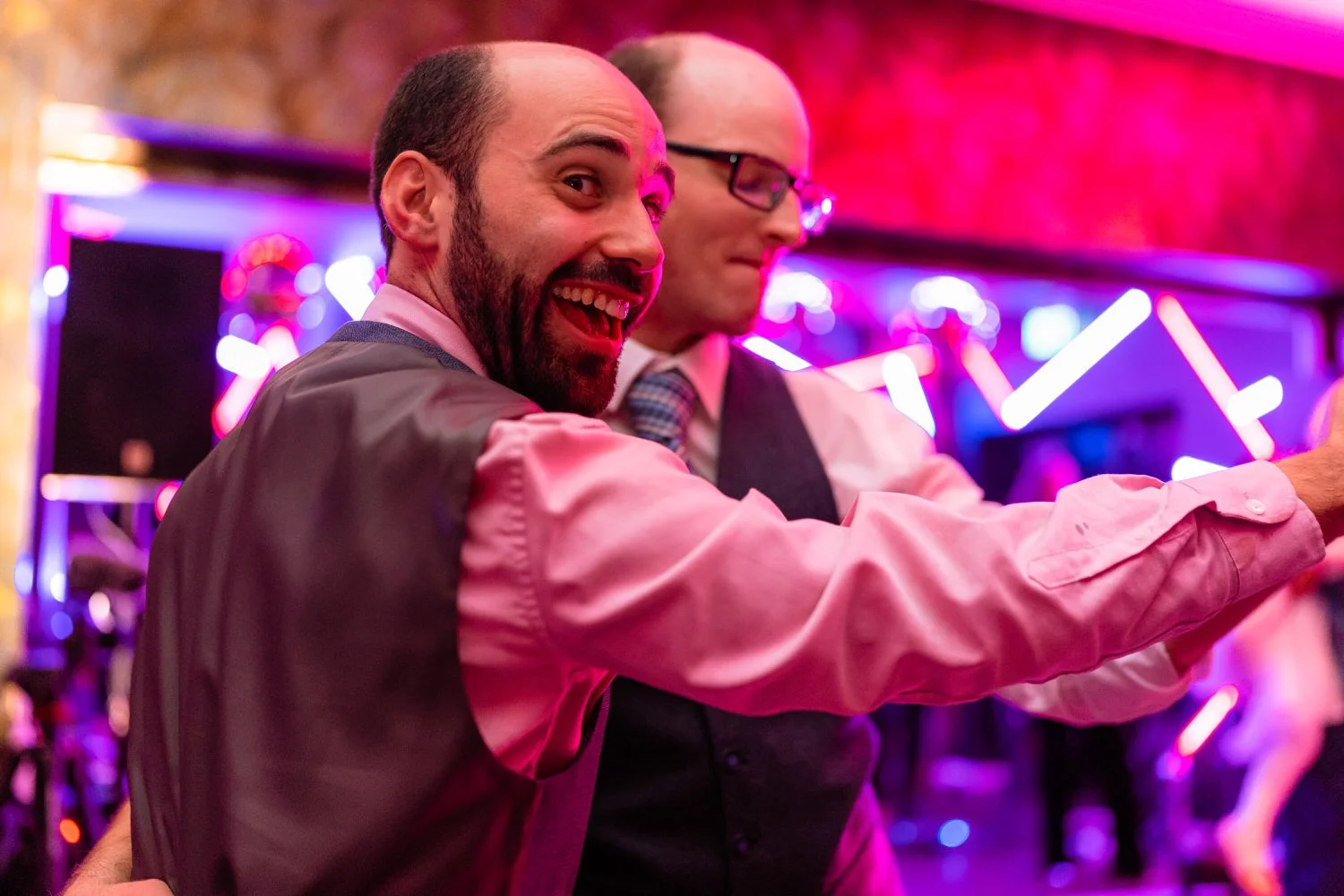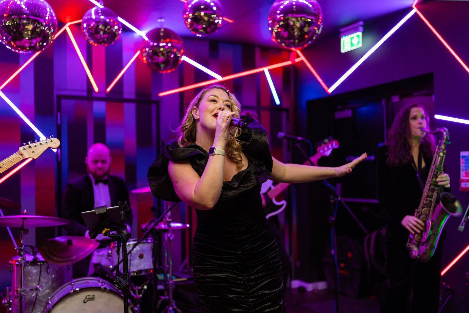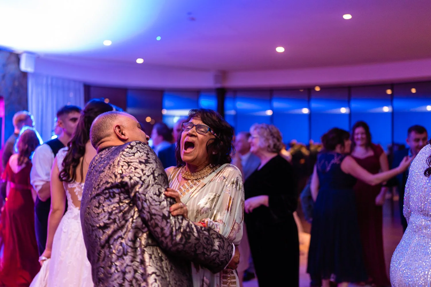 After the first dance, the band Velvet Soul took the stage, and soon everyone joined in the celebration. The neon lighting background at Sant Ffraed makes for great dance-floor photographs. The wedding turned from a fun celebration into a lively party, with no lull in the dance moves being thrown across the K room.