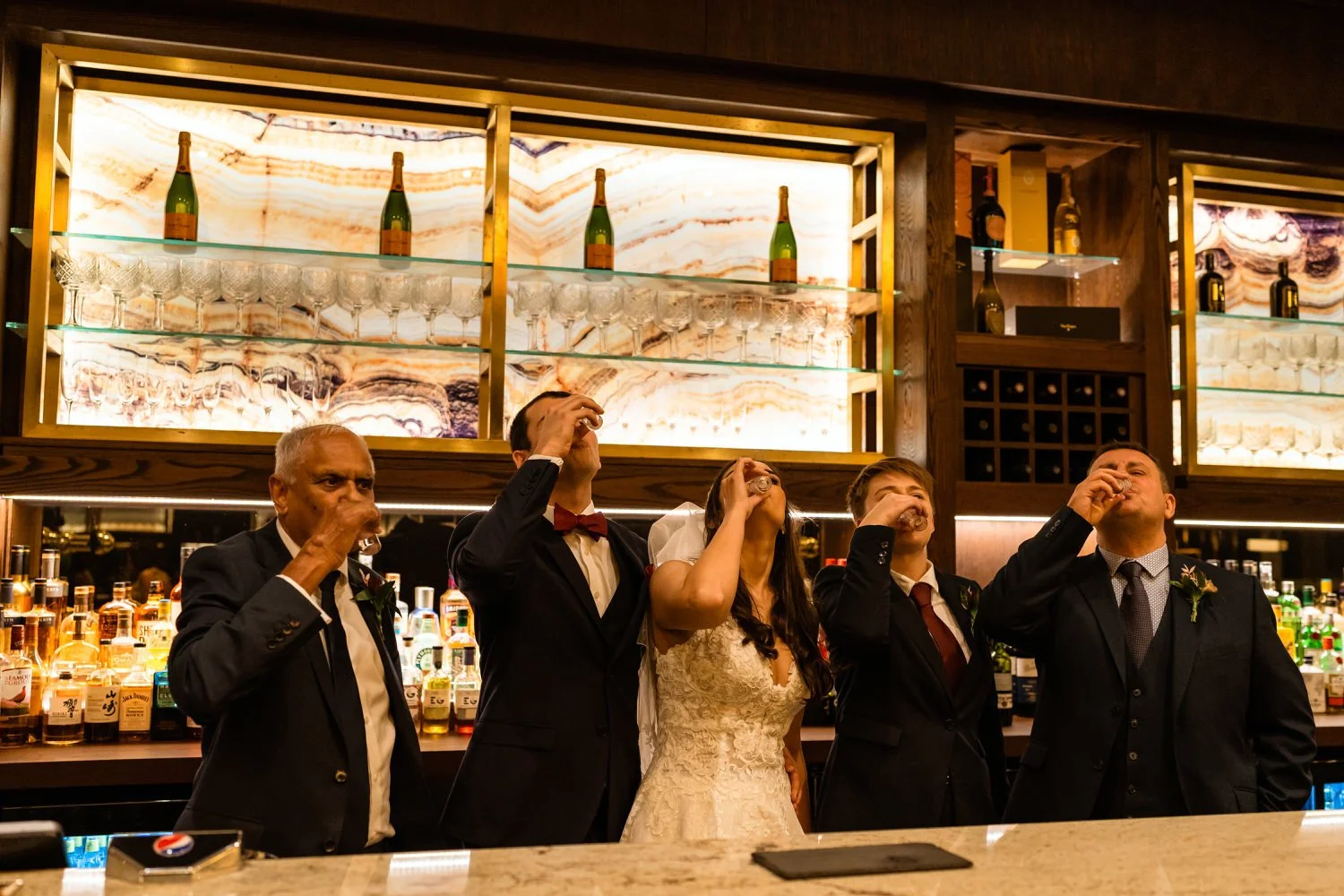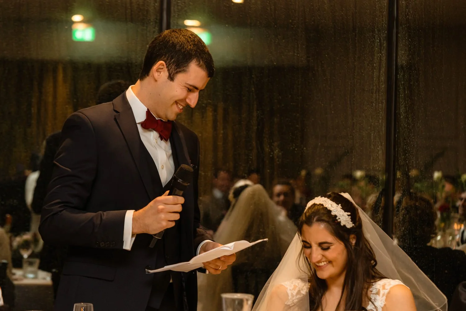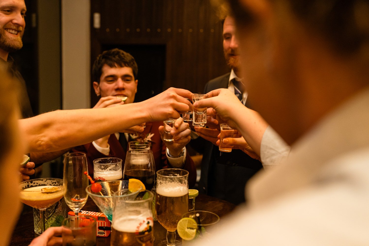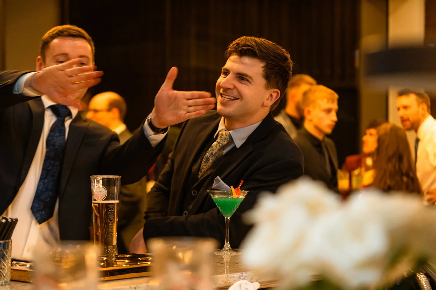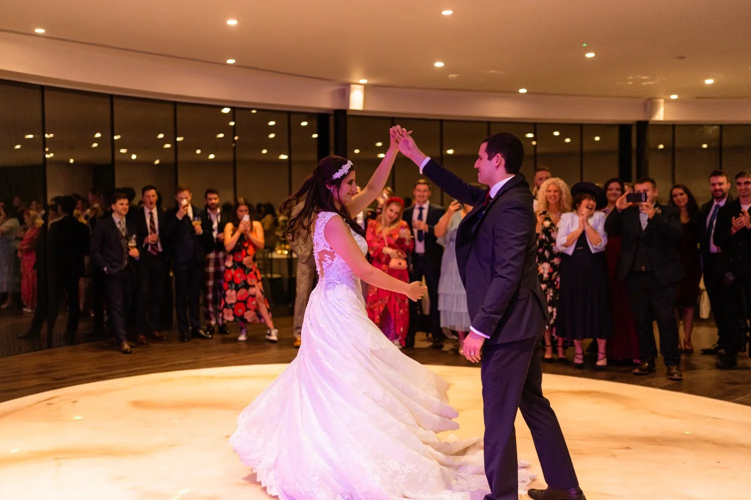After the first dance, the band Velvet Soul took the stage, and soon everyone joined in the celebration. The neon lighting background at Sant Ffraed makes for great dance-floor photographs. The wedding turned from a fun celebration into a lively party, with no lull in the dance moves being thrown across the K room.