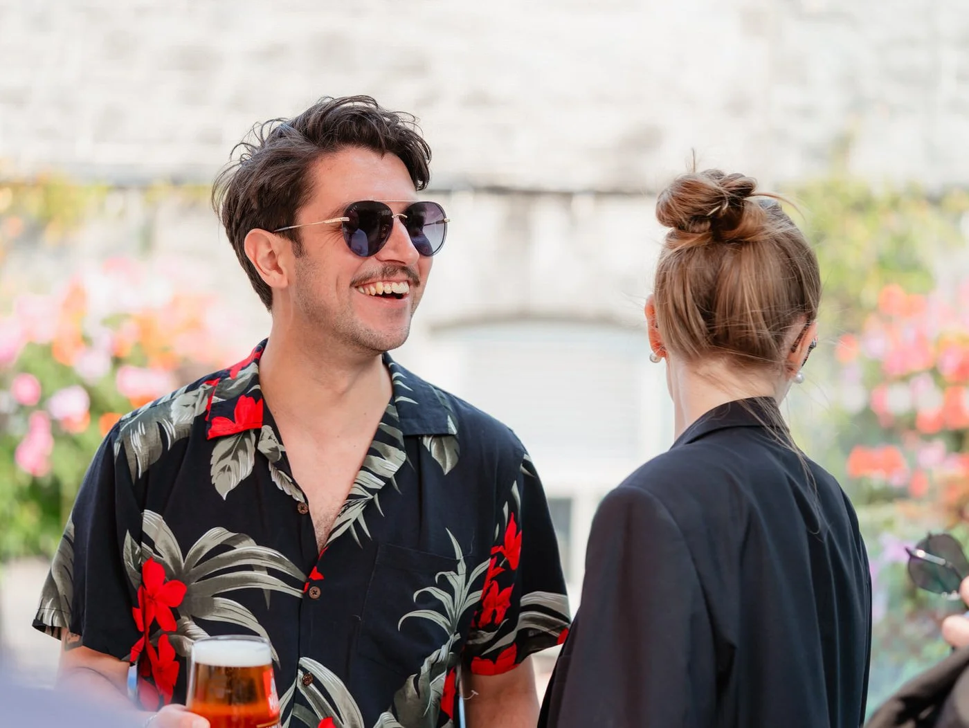 Colourful wedding guests enjoying themselves outside in the glass covered courtyard at the Bear Hotel in Cowbridge, a white wall with climbing flowers behind them