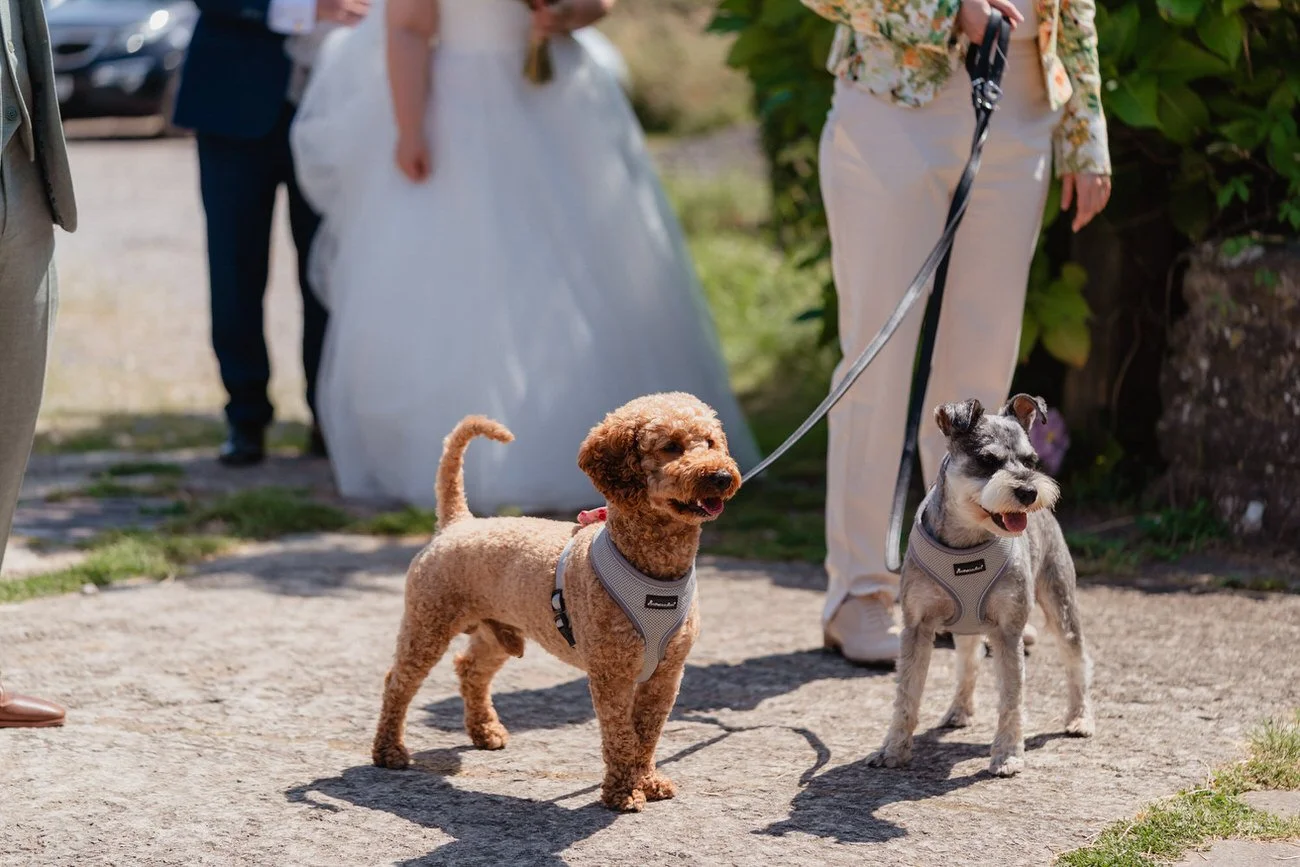 Percy and Mash, the couple’s two very sweet dogs, were given extremely important roles walking down the aisle. They were keen to congratulate their humans immediately after the vows, and the bride happily let them climb onto the dress for a cuddle. It was joyful, slightly chaotic and completely perfect. When it came to confetti outside the Clyne Farm stone building, colourful paper filled the air and the couple were so excited they ran straight through it laughing. They moved so quickly the first time that we had to do it again.