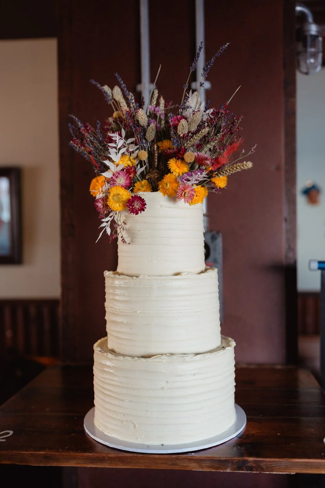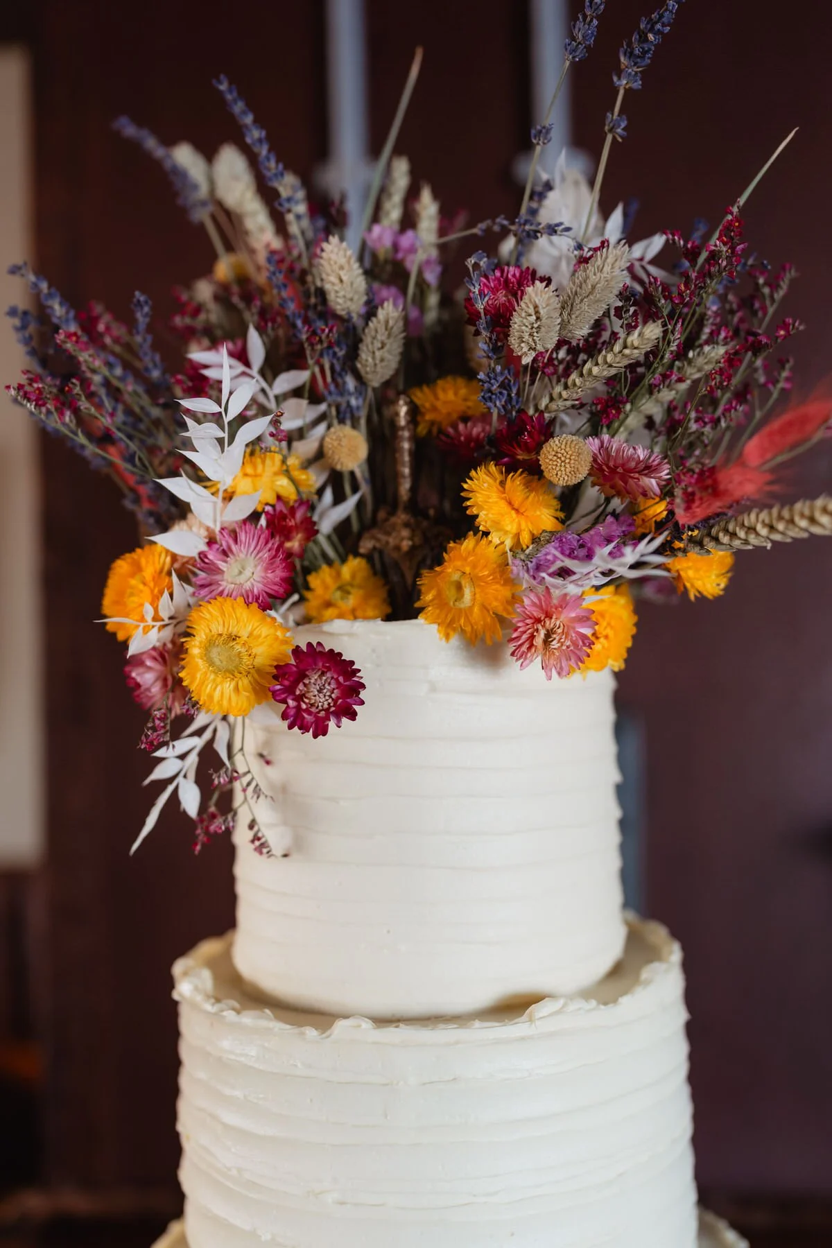 The ceremony space was simply decorated with crochet flowers on the back of each chair and a backdrop of streamers moving gently in the breeze. Wildflowers and handmade details ran through everything.