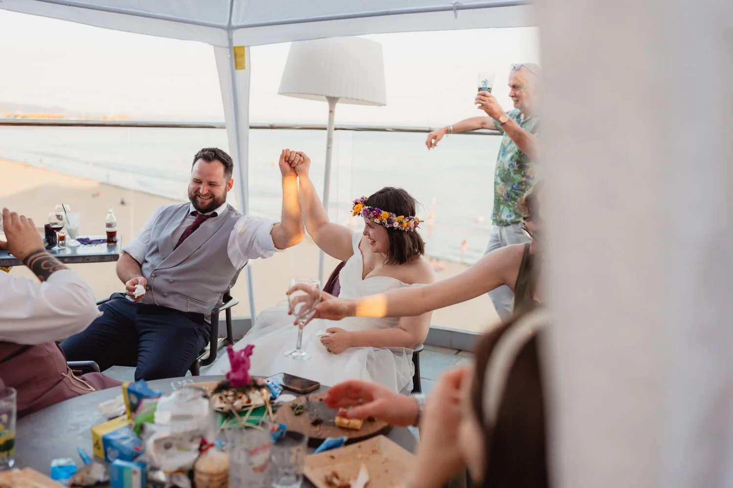 Some of the younger guests handled the heat by heading down for a dip in the sea. When your reception venue is directly on the Swansea promenade, that is a strong option.