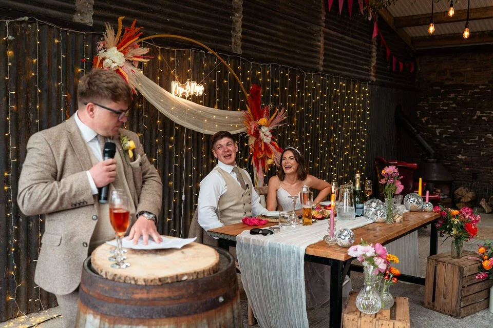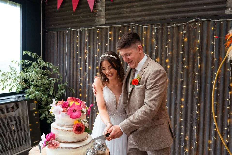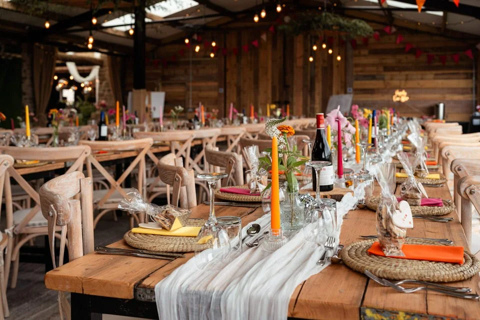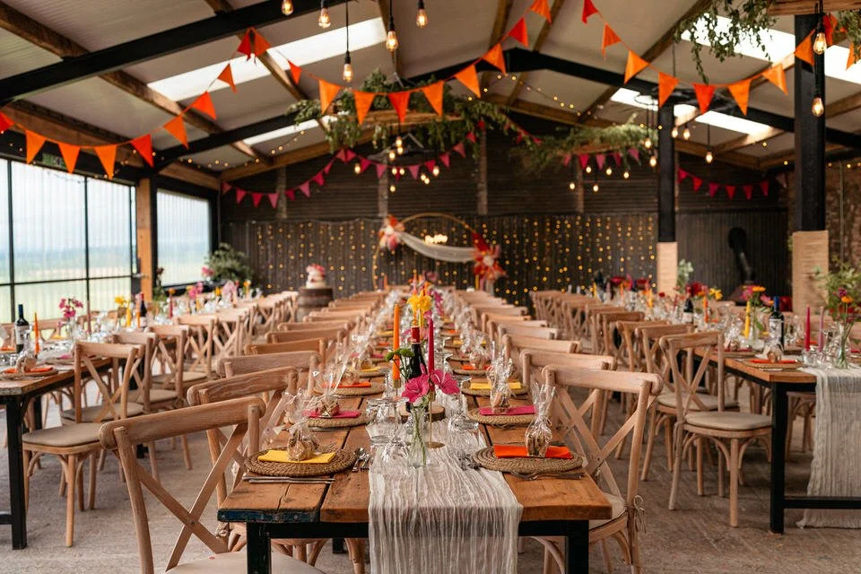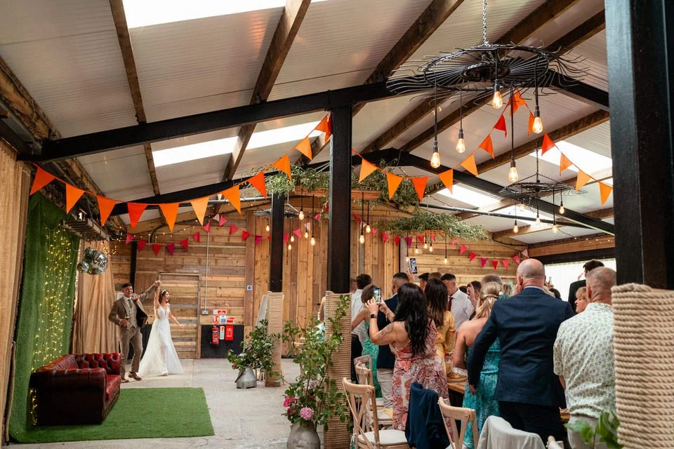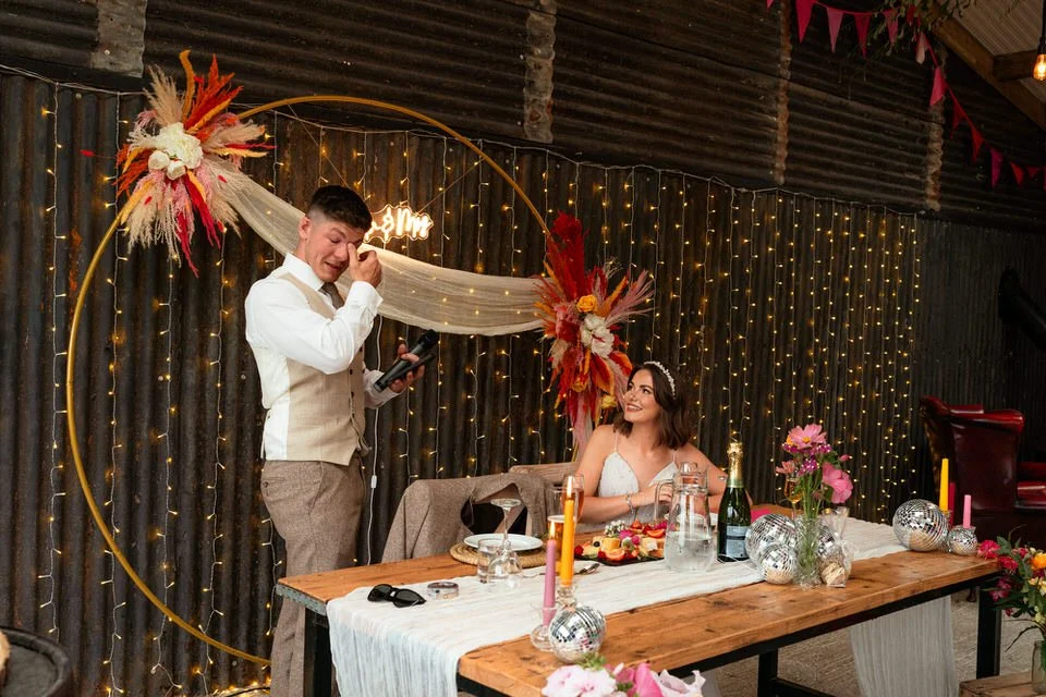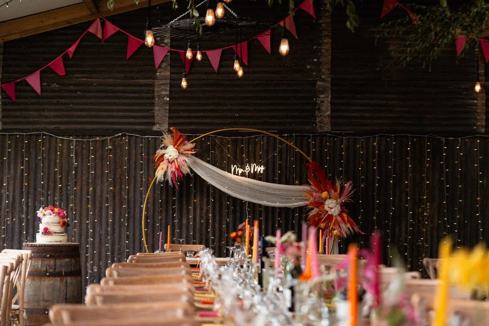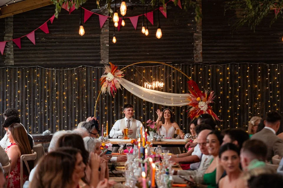 The barn was transformed into a colorful wonderland! From vibrant wildflowers and hand-dyed pampas grasses to charming bunting in bold pinks and oranges, every detail was a nod to the couple’s fun-loving personalities. It was all about creating a warm, welcoming atmosphere, and the decor definitely delivered. The feasting-style dining setup created by Epic Caterers was an absolute hit, allowing guests to indulge in delicious dishes while enjoying the lively and relaxed vibe of the day.