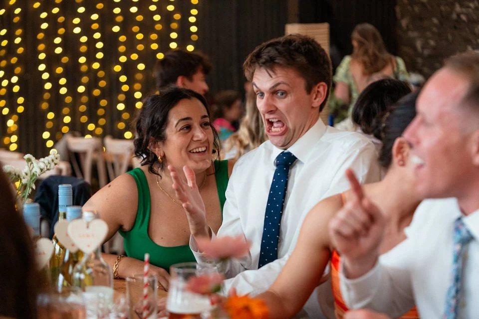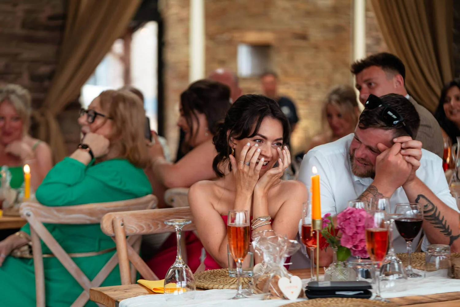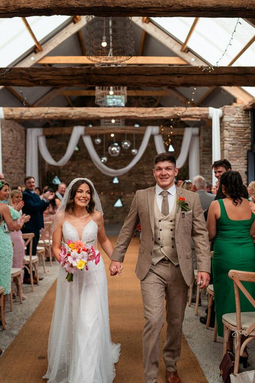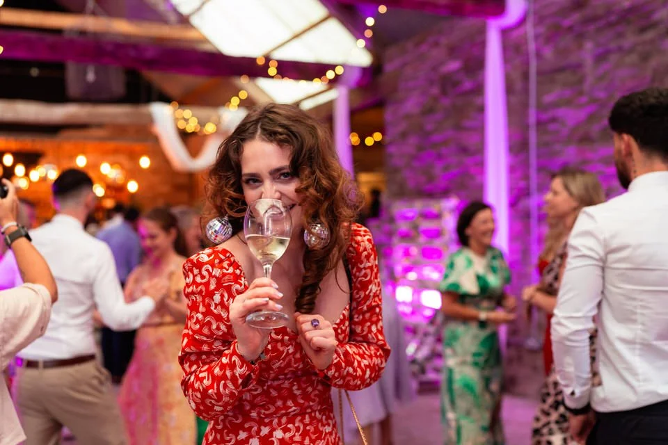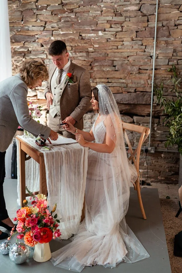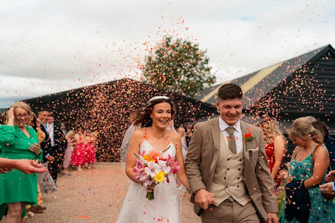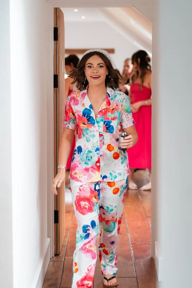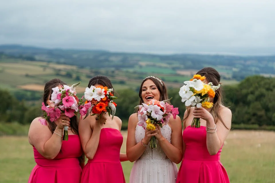 The barn was transformed into a colorful wonderland! From vibrant wildflowers and hand-dyed pampas grasses to charming bunting in bold pinks and oranges, every detail was a nod to the couple’s fun-loving personalities. It was all about creating a warm, welcoming atmosphere, and the decor definitely delivered. The feasting-style dining setup created by Epic Caterers was an absolute hit, allowing guests to indulge in delicious dishes while enjoying the lively and relaxed vibe of the day.