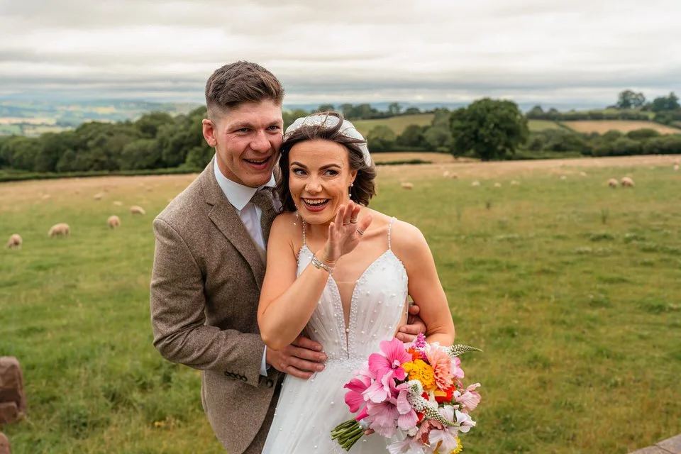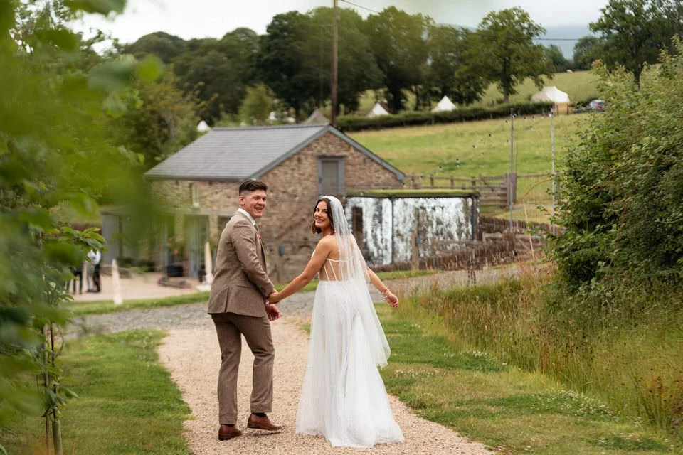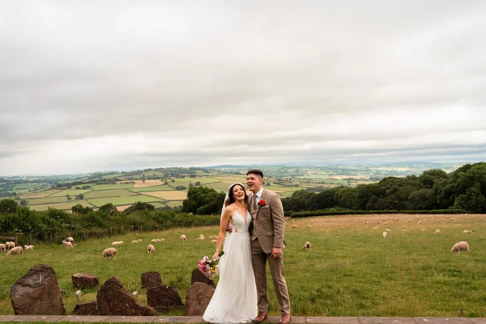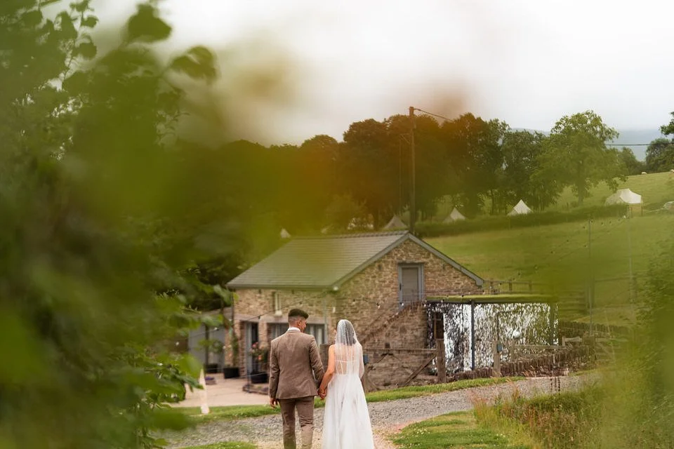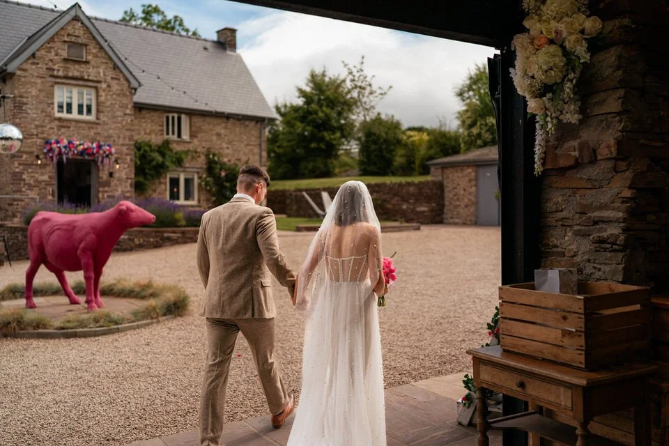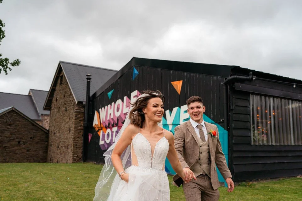 One of the highlights for us was the “A Whole Lot of Love” mural on the barn’s wall. Not only was it a beautiful focal point, but it also tied in perfectly with the couple’s venue name! Plus, the breathtaking views over Brecon’s hills and the farm’s sheep-filled fields created the perfect backdrop for the couple’s wedding photos and videos.