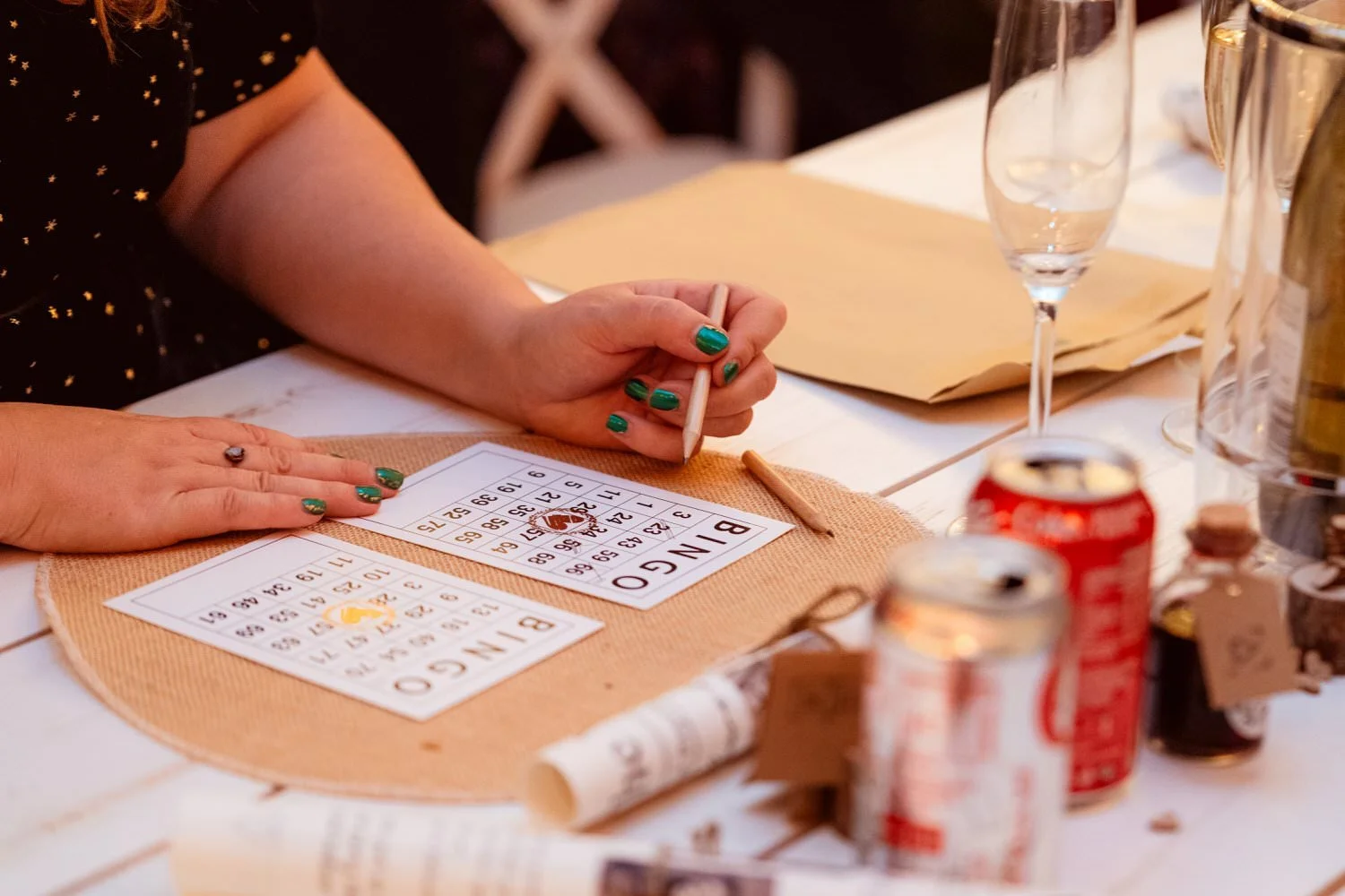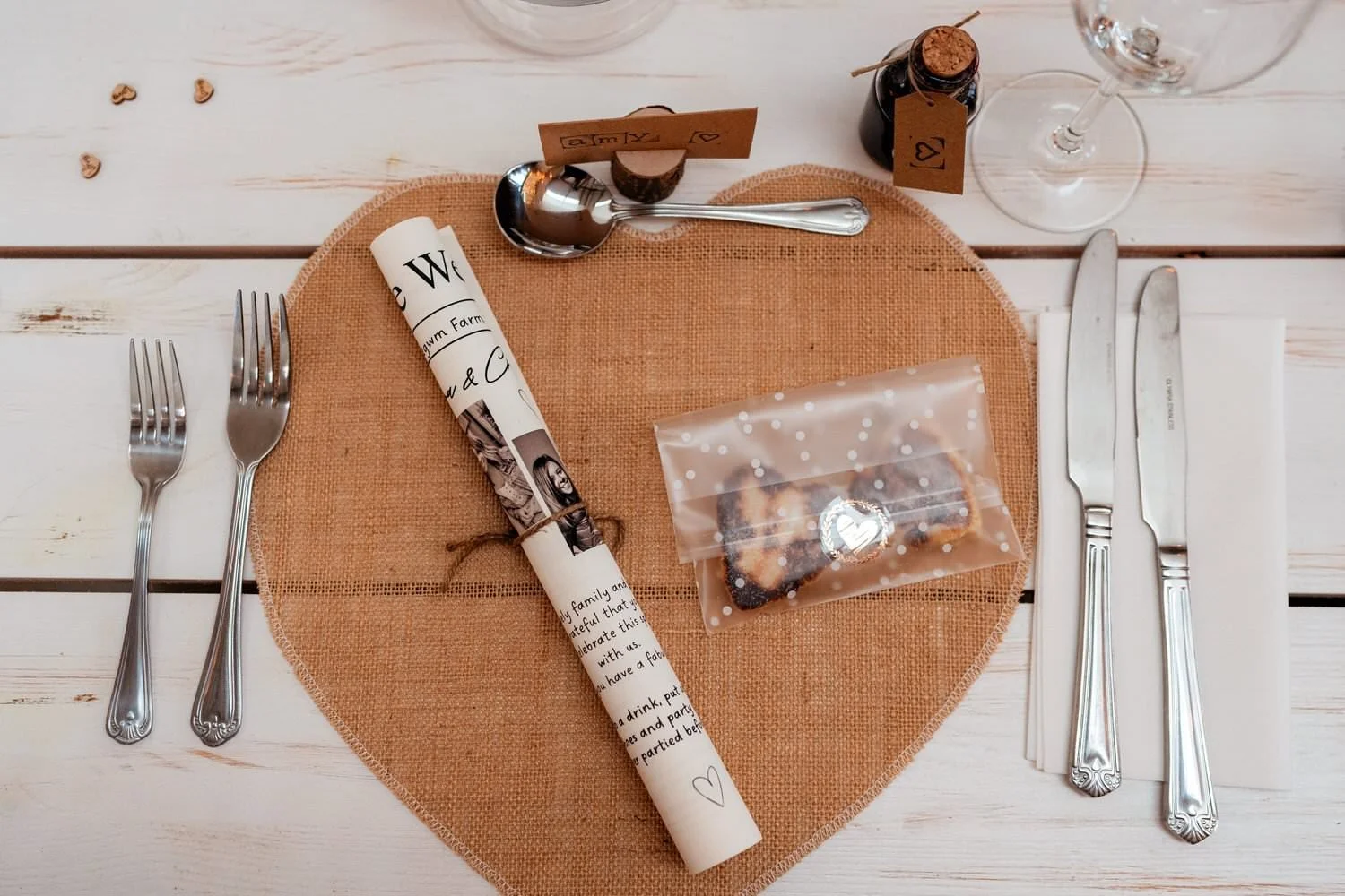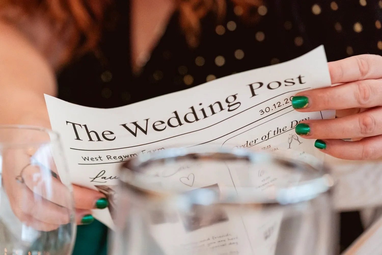 It was a DIY wedding in terms of decor, with lots of crafting evenings spent stamping, tying, and rolling to bring together a simple yet thoughtful setup - mini bottles of port, Welsh cakes, personalized newspapers, and table place names. The venue’s empty converted barn is big enough for a couple hundred guests, but a blank space to do whatever your imagination can picture. Winnies Catering was brought in to supply homely hot food in the form of pies, roast potatoes, vegetables, and gravy, a perfect winter warmer.